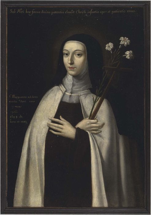 Inscription (latin) : Sub Miti hac forma divina potentia clausit Christi infantis opes et patientis omus (en haut du portrait). Inscription (latin), date : St Marguarita a.S.Sacra mento Vixit [...] 1648 du hora 10 mati (à gauche).