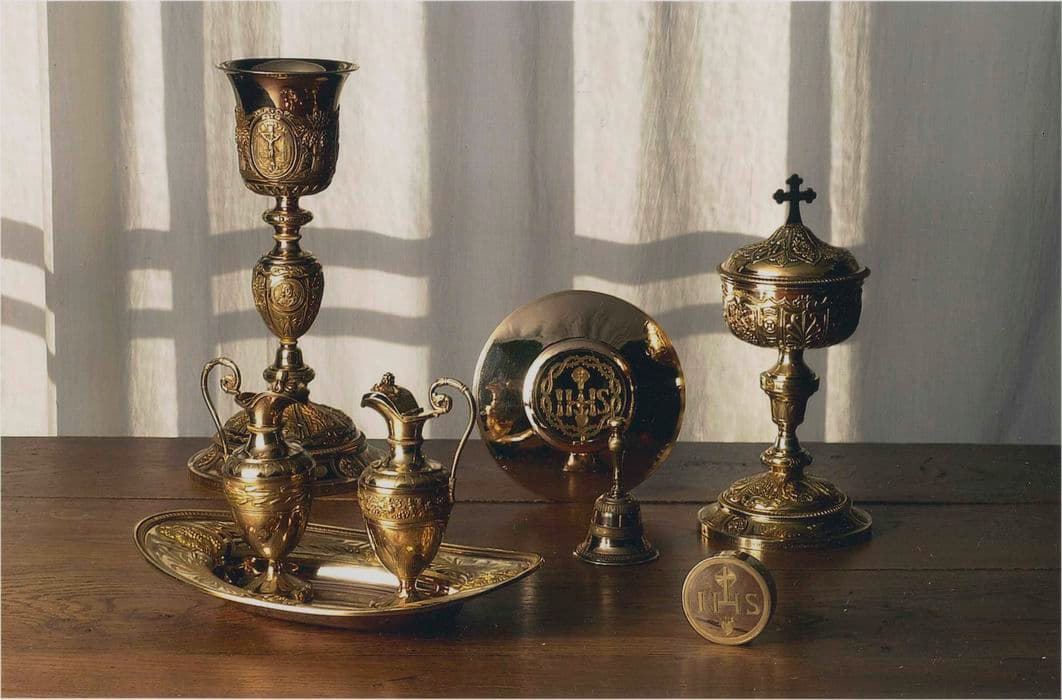 calice ; patène ; ciboire ; burettes ; plateau à burettes ; clochette d'autel ; ciboire des malades ; coffret