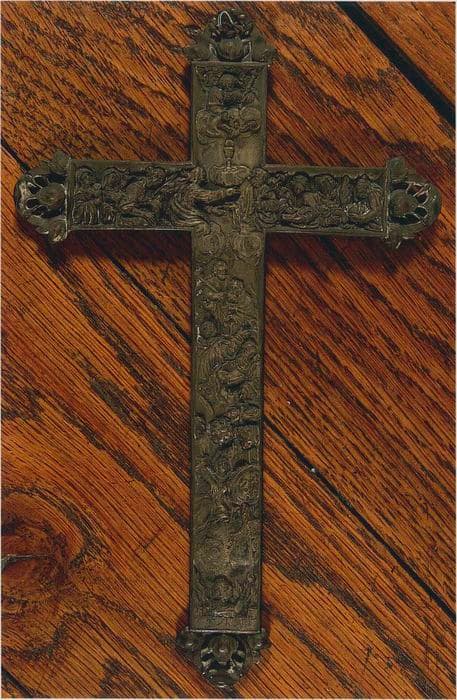 Cette croix est ornée, de haut en bas : de Dieu le Père, d'un calice et d'une hostie, de saint Jean-Baptiste, de saint Augustin (?), d'un moine, de saint Benoît écrivant sa règle, d'un ange introduisant au ciel une âme symbolisée par un enfant, de saint Michel terrassant le dragon, des flammes de l'enfer avec un personnage. De gauche à droite : sainte Gertrude (coeur), une femme ou une moniale, saint Agnès (agneau), la Vierge, saint Joseph, saint Jean l'Evangéliste, saint Etienne martyr, sainte Marie-Madeleine.