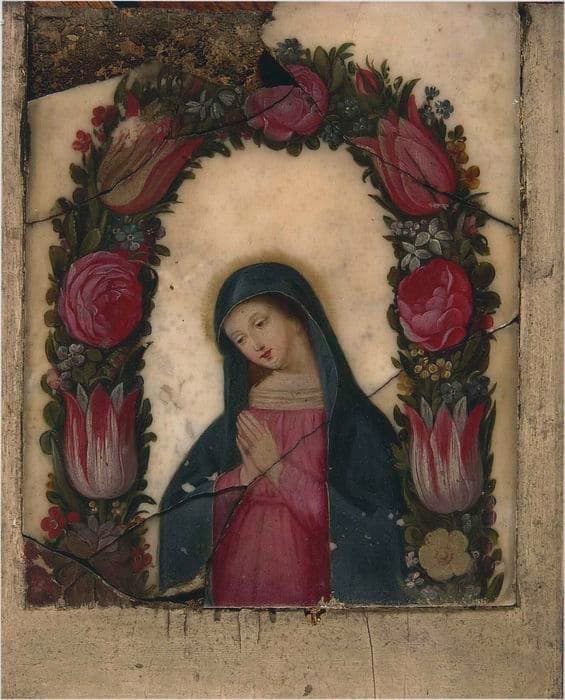 2 peintures (tableautins en pendant) : La Vierge en prière entourée de fleurs, Le Christ bénissant entouré de fleurs