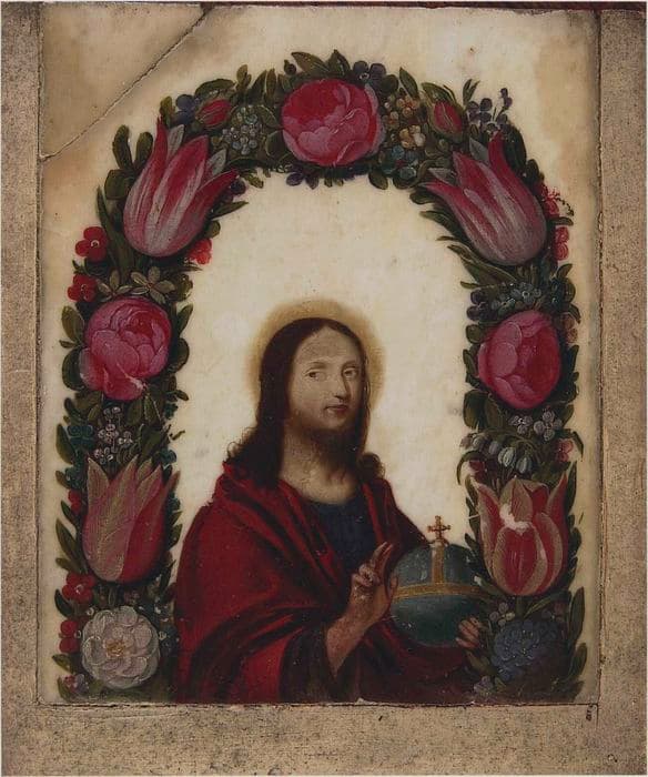 POP | Plateforme ouverte du patrimoine2 peintures (tableautins en pendant) : La Vierge en prière entourée de fleurs, Le Christ bénissant entouré de fleurs