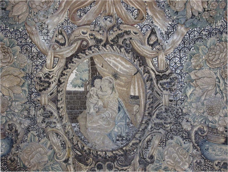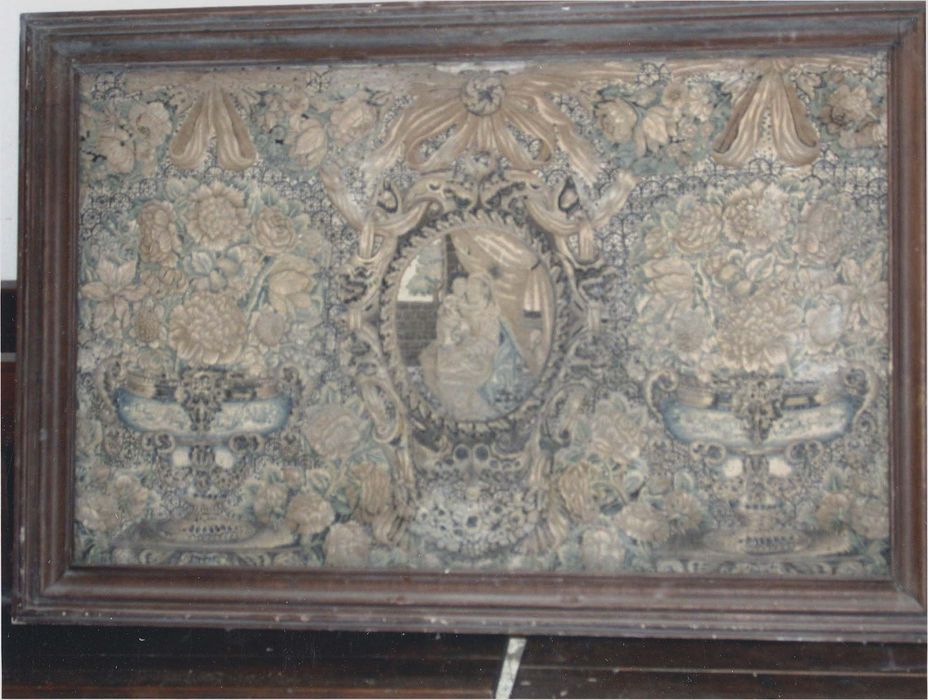 Probablement issu d'un atelier d'une congrégation religieuse de femmes (un couvent d'Ursulines ?), cet antependium a été transformé en tableau d'autel par l'abbé Mancel en 1874.