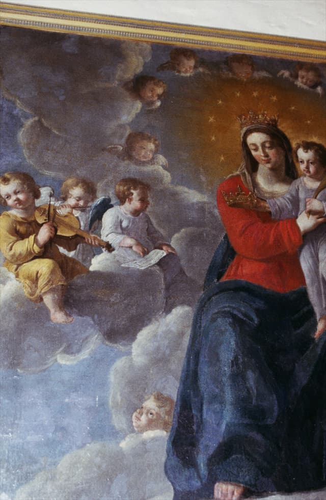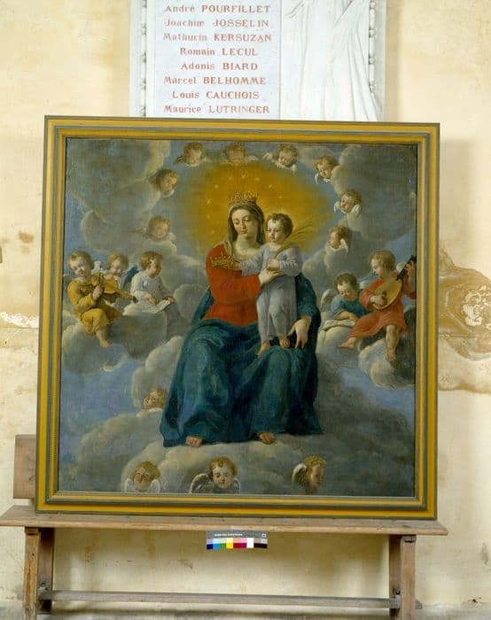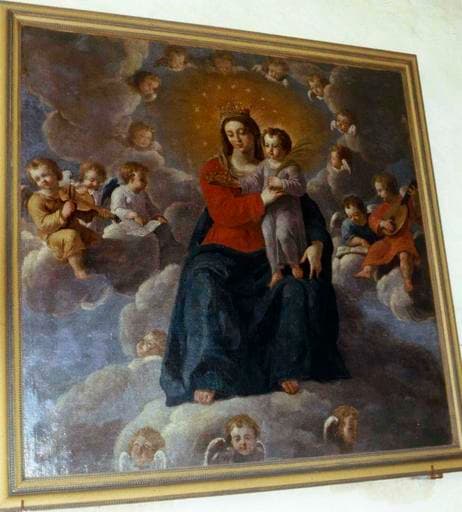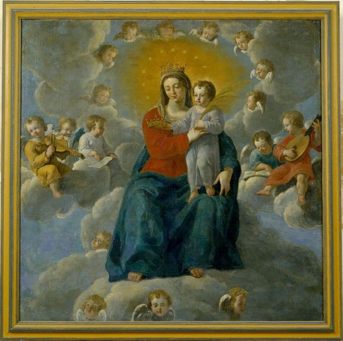 Huile sur toile représentant la Vierge couronnée, assise dans les nuées, l'Enfant debout sur ses genoux tient une palme et une couronne . Ils sont entourés d'anges musiciens.
