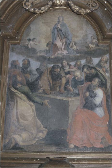 Huile sur toile rectangulaire cintrée représentant l'Assomption de la Vierge.