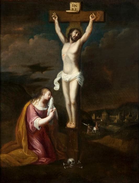 Le Calvaire est représenté dans une ambiance nocturne, sur un ciel chargé de nuages. L'éclairage lunaire, qui met en évidence la blancheur des chairs, accuse l'intensité dramatique du moment. Au premier plan, Marie-Madeleine et Jésus sur la croix se retrouvent dans l'intimité, tous les autres acteurs de la Crucifixion ayant déserté le mont du Golgotha. La Madeleine est agenouillée à gauche de la croix ; accablée par le chagrin, elle n'en garde pas moins une certaine retenue que traduit son attitude noble : une larme perle sur sa joue droite tandis qu'elle essuie pudiquement son oeil gauche d'un coin de son mouchoir. Le Christ nimbé, encore vivant, détourne son regard vers la droite. Ses bras sont tendus à l'oblique (un repentir de la main gauche fixée à la croix a été laissé apparent après restauration). On lit sur les traits tirés de son visage la douleur et la résignation. Ses pieds parallèles reposent sur le suppedaneum. Des gouttes de sang continuent de s'écouler de chacune de ses plaies. Au pied de la croix, la réverbération du crâne d'Adam agit sur le spectateur comme un memento mori. La légèreté de la touche picturale rend les linges vaporeux, presque transparents ; le chatoiement des étoffes ocre et parme apporte beaucoup de préciosité au vêtement de Marie-Madeleine. Au loin, les fortifications de Jérusalem se détachent de la pénombre. Au plan intermédiaire, le peintre a introduit une scène anecdotique : la croupe d'un cheval blanc, en accrochant la lumière, attire l'attention sur deux petits personnages qui, vus de dos, rejoignent Jérusalem par un chemin sillonnant à travers les collines ; le cavalier accompagné de son écuyer, portant un étendard sur l'épaule, sont vêtus à la mode orientale.