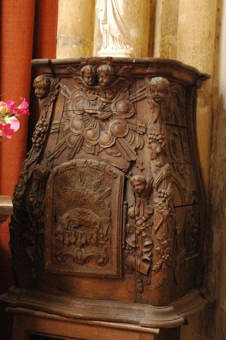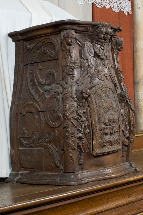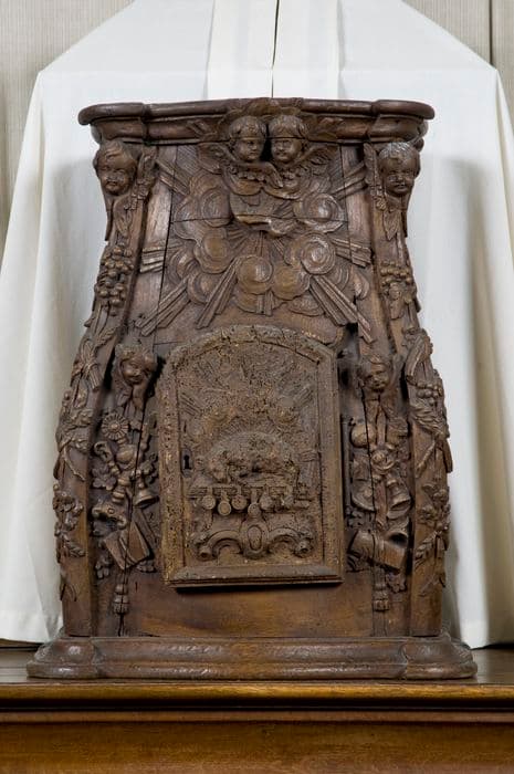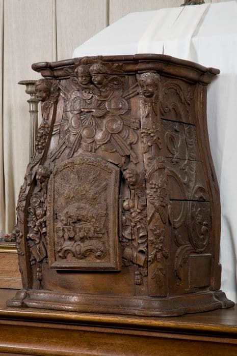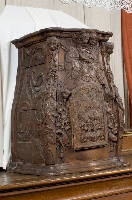 Tabernacle à élévation galbée, avec porte sculptée. Le décor en relief, de belle facture, sculpté abondamment sur toute la surface de l'objet est disposé de manière très équilibrée dans ses proportions et ses sujets. Les motifs alternent la symbolique habituelle de la liturgie et l'ornementation propre au 18e siècle. Les moulures et les côtés sont également sculptés.