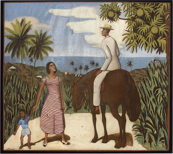 tableau : Cavalier discutant avec une femme tenant un petit garçon par la main dans un paysage de bananiers