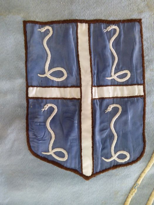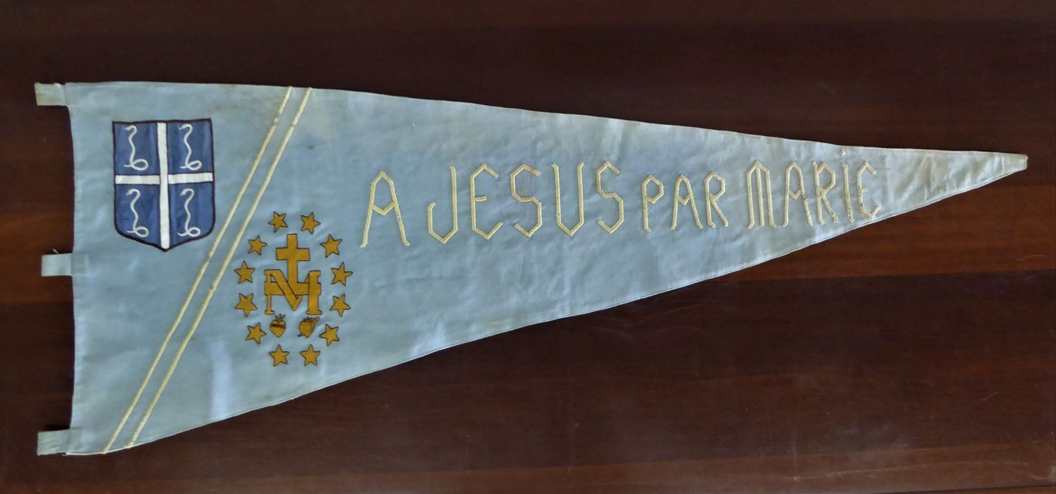 Commission départementale des objets mobiliers du 11/05/1992. Intitulé de l'arrêté : une bannière Notre Dame des Iles, Trois Ilets, à Jésus par Marie avec l’écusson de la Martinique en coton beige et bleu pâle.
