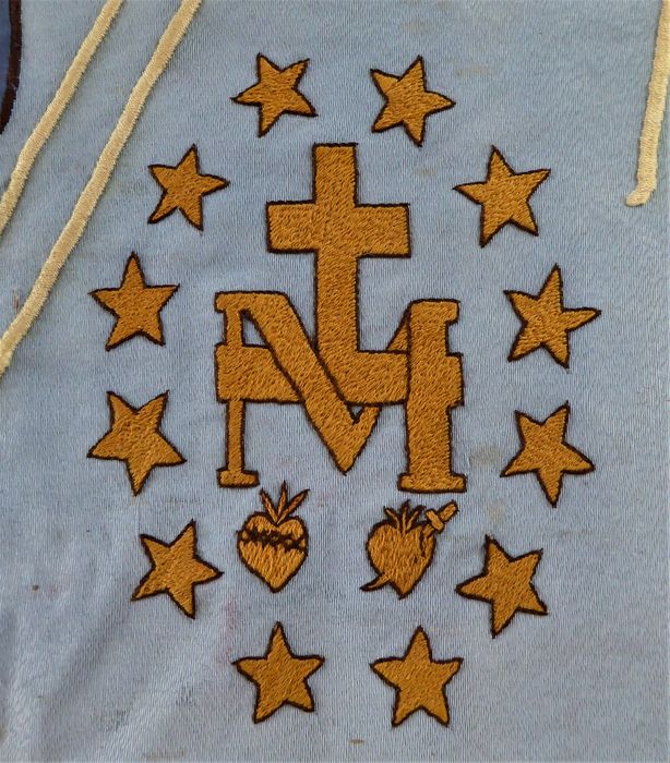 Sacré-Cœur de Jésus et Sacré-Cœur de Marie ; au-dessus la lettre M surmontée d'une croix ; l’ensemble est entouré des douze étoiles symbolisant les apôtres.