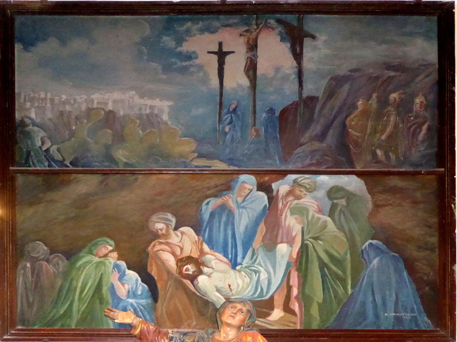 Commission Départementale des Objets Mobiliers du 05/04/1994. Intitulé de l'arrêté : Le lamentin - Eglise Saint-Laurent [...] Deux panneaux peints sur isorel mou, double registre, du Père Arosteguy, de 1955...