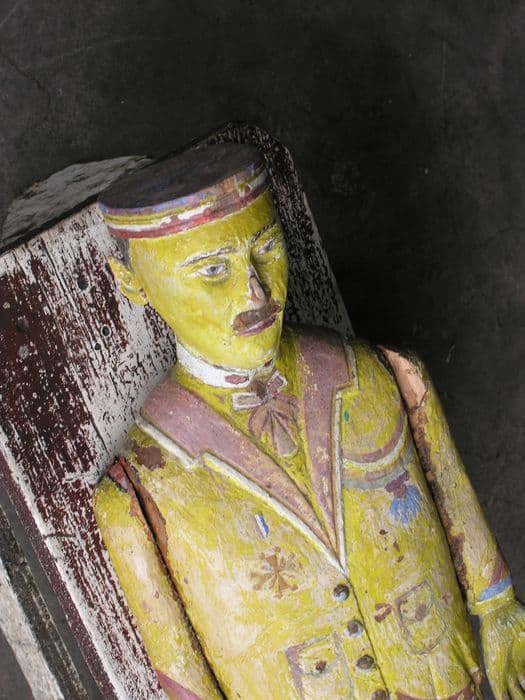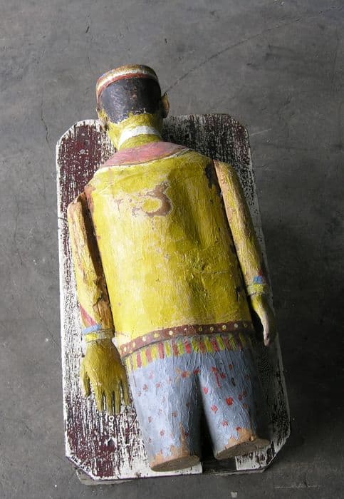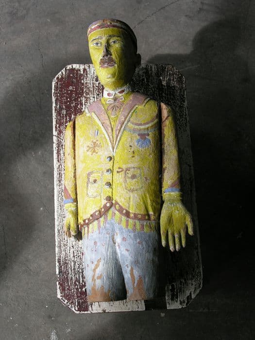 Statue en bois sculptée au couteau. Le colonel porte une veste ornée de décorations ainsi qu'un pantalon. Sa main gauche, qui est tournée vers l’avant, est disproportionnée. Le jaune (tête, veston, pantalon, bras, le marron (moustache, collerettes, bordures), le rouge (lèvres, pantalon) et le bleu (pantalon, manches, décorations) sont les couleurs dominantes. La peinture est écaillée et manquante à certains endroits du pantalon, du dos ainsi que du nez.