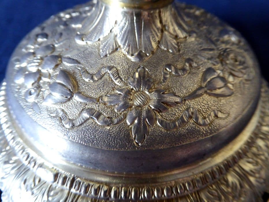 Ciboire en métal (?) doré, décor repoussé et ciselé. Le fond du décor du pied, du nœud, de la coupe et du couvercle est ciselé au mat ; la frise du pied est estampée.