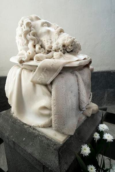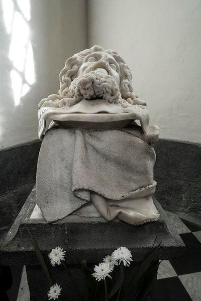 Sculpture représentant la tête décollée de saint Jean-Baptiste, posée sur un plat ovale, reposant sur un socle drapé d'une peau d'agneau.