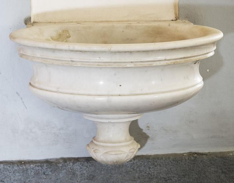 Il n'a pas été possible de déterminer si ce bénitier date des années 1830 ou des années 1860. L'inventaire des biens de la cathédrale rédigé en 1911 le recense sous le n° 93 : un bénitier en marbre blanc scellé eu mur.