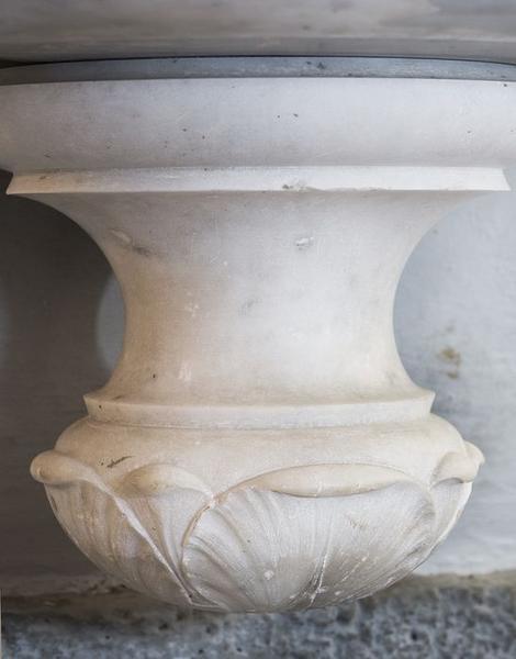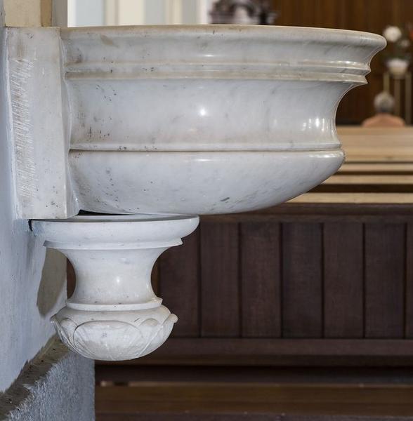 Bénitier en marbre blanc comportant une vasque oblongue et un fronton orné d'une croix trilobée.