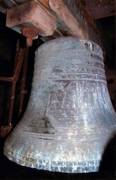 Cloche en bronze avec inscription et décor. Sans battant, ni possibilité d'en accrocher, cette cloche a toujours été actionnée par tintement : deux marteaux de fer sont montés sur le joug de suspension, les anses de la cloche sont intégrées à une demi-poutre boulonnée à une poutre de charpente. Poids = 100 kg environ.