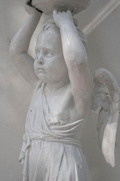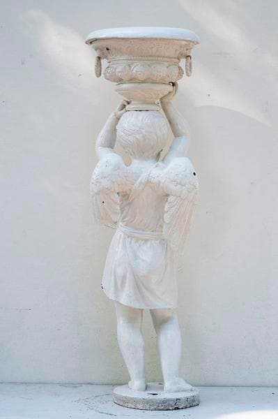 Paire de bénitiers en fonte de fer représentant des amours tenant une coupe sur leur tête.