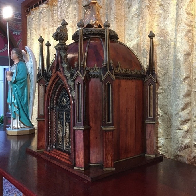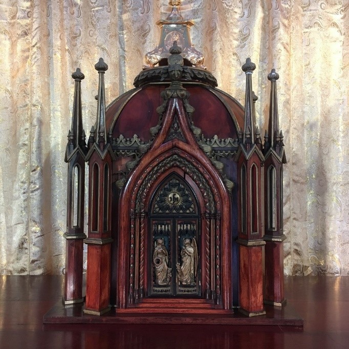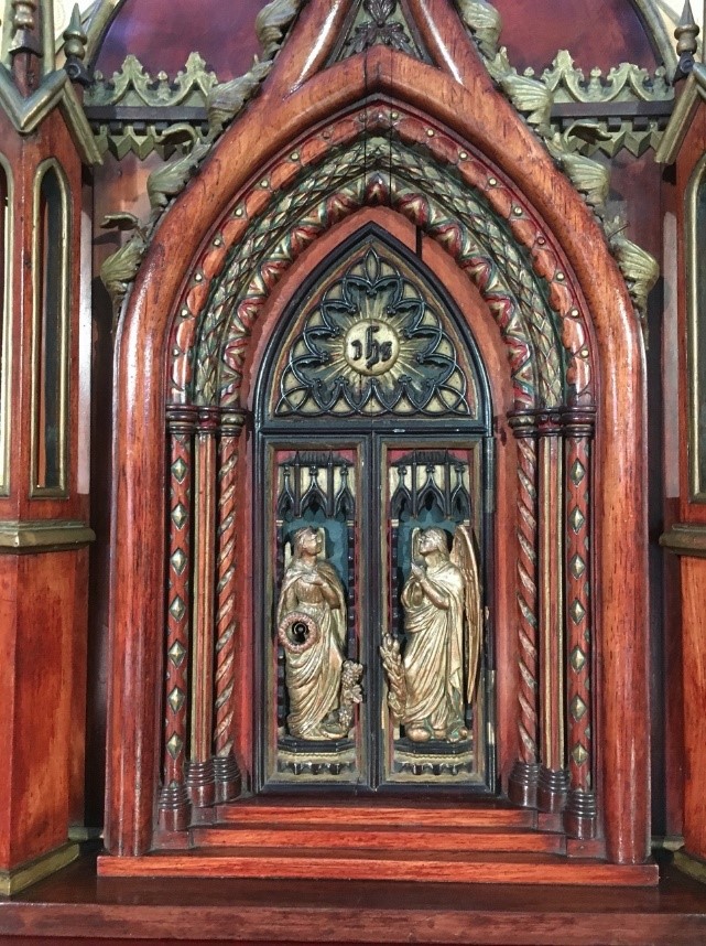 Le tabernacle, aujourd'hui posé à l'arrière de l'autel sur une autre table, présente une forme très architecturée. Selon une tradition orale le Frère Renacle se serait inspiré de la chapelle funéraire de la famille royale d'Orléans à Dreux. Couronné d'un dôme dont le sommet était couronné à l'origine d'une croix en bois, des contreforts terminés par des fins pinacles flanquent les angles de ce petit monument. Sur la face avant, une porte en ogive décorée de fines voussures sculptées. Les portes du tabernacle sont décorées de deux figures en bas-relief représentant l'Annonciation. Un tympan la surmonte, décoré d'un fin réseau d'arcatures au centre duquel se trouve un cercle dans des rayons de soleil portant les lettres IHS, abréviation du nom de Jésus en grec. ces deux pièces néogothiques en bois sombre, probablement du bois de natte, sont soulignées de filets dorés, délicate polychromie qui cependant n'est plus celle d'origine, la couleur or du meuble ayant fait l'objet de repeints.