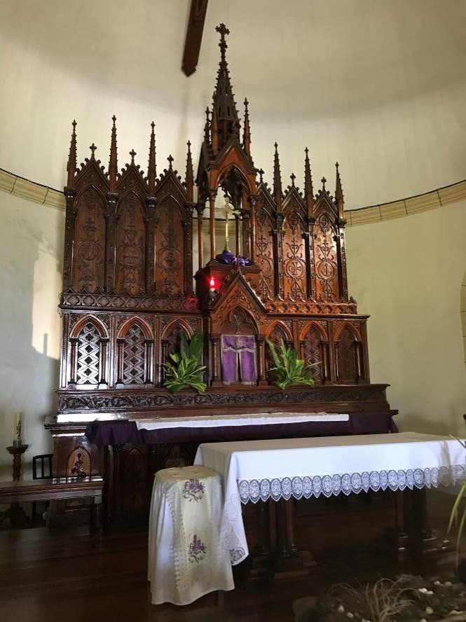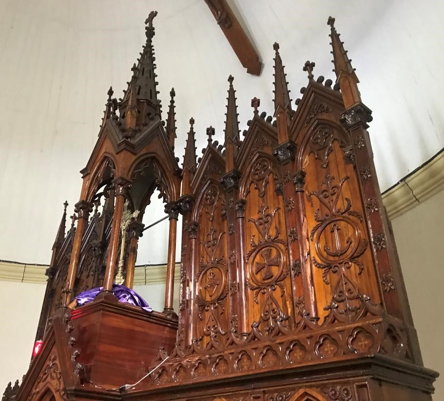 Monumental, il a été réalisé en grande natte et en bois d'olives, deux essences locales qui sont reprises par la suite pour les autres autels de l'église et la table de communion. Il se divise en trois parties : - un premier niveau forme l'autel proprement dit. Il présente en façade des colonnes jumelées néogothiques détachées du corps de l'autel. Elles encadrent des arcatures en double ogives supportées par des colonnes jumelées plus petites. Des écoinçons sculptés de grappes de raisins relient les ogives entre elles. Au centre des ogives, des panneaux en bois d'olives possèdent un décor végétal sculpté, des branches de roses, et un panneau présentant les initiales du Christ en grec ; - un second correspond à celui où se trouve le tabernacle. Il se détache légèrement au centre de six panneaux décorés d'arc en ogive simple supporté par des colonnes à chapiteaux sculptés de motifs végétaux. Ces ogives encadrent des panneaux décorés de rosaces incluses dans une sorte de damier en losange. La porte du tabernacle est flanquée de colonnes supportant un arc à double ogive surmonté d'un fronton décoré de fleurons. L'ensemble de ces éléments reposent sur une base, les reliant à l'autel, sculptée d'une très fine frise d'épis de blé et de grappe de raisins ; - un troisième enfin entoure un baldaquin de section carrée surmonté d'une flèche portée par quatre fines colonnettes. Un riche décor de feuilles de choux et de pinacles décore la flèche. Six panneaux répartis par groupe de trois de part et d'autre du baldaquin forment une sorte d'écran. Ces panneaux sont encadrés de pilastres supportant des frontons et des pinacles, décor néogothique très architecturé, accentuant la verticalité du meuble. Chaque panneau possède aussi un décor composé de rinceaux symétriques : deux d'entre eux sont décorés d'ancres marines, deux autres d'une croix de Malte et enfin, ceux les plus proches du baldaquin d'un coeur entouré d'une couronne d'épines.
