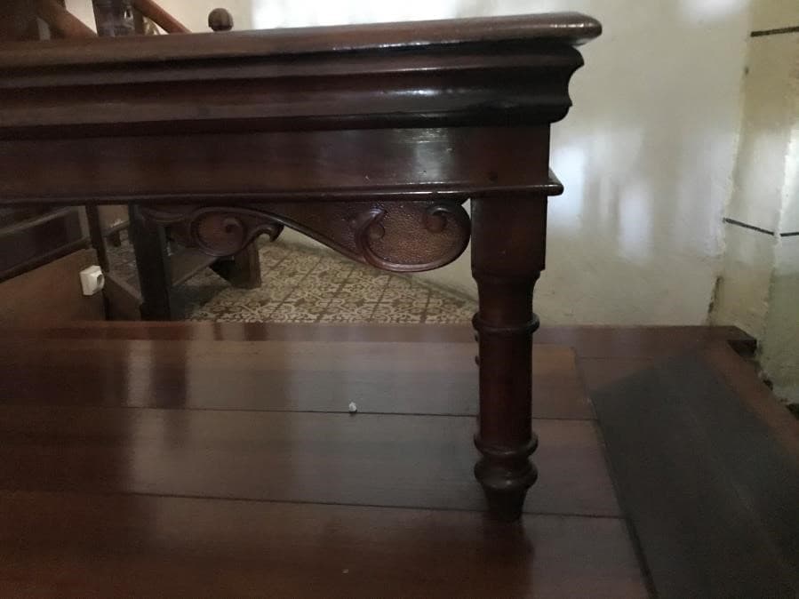 Les quatre pieds tournés sont surmontés de chapiteaux et portent l'assise. Celle-ci, un simple plateau de bois, est soulignée d'une large moulure sur le pourtour. L'ensemble est bois de natte.