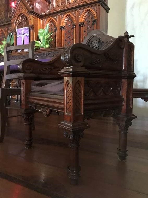 En bois de natte et de forme presque carrée, l'assise est portée par quatre colonnes à chapiteaux sculptés. Elles se prolongent par des montants carrés décorés d'arcs en ogive. Deux larges consoles sculptées forment les accotoirs. Le dossier trilobé est sculpté d'un calice d'épis de blé et d'une grappe de raisin, le tout en relief.