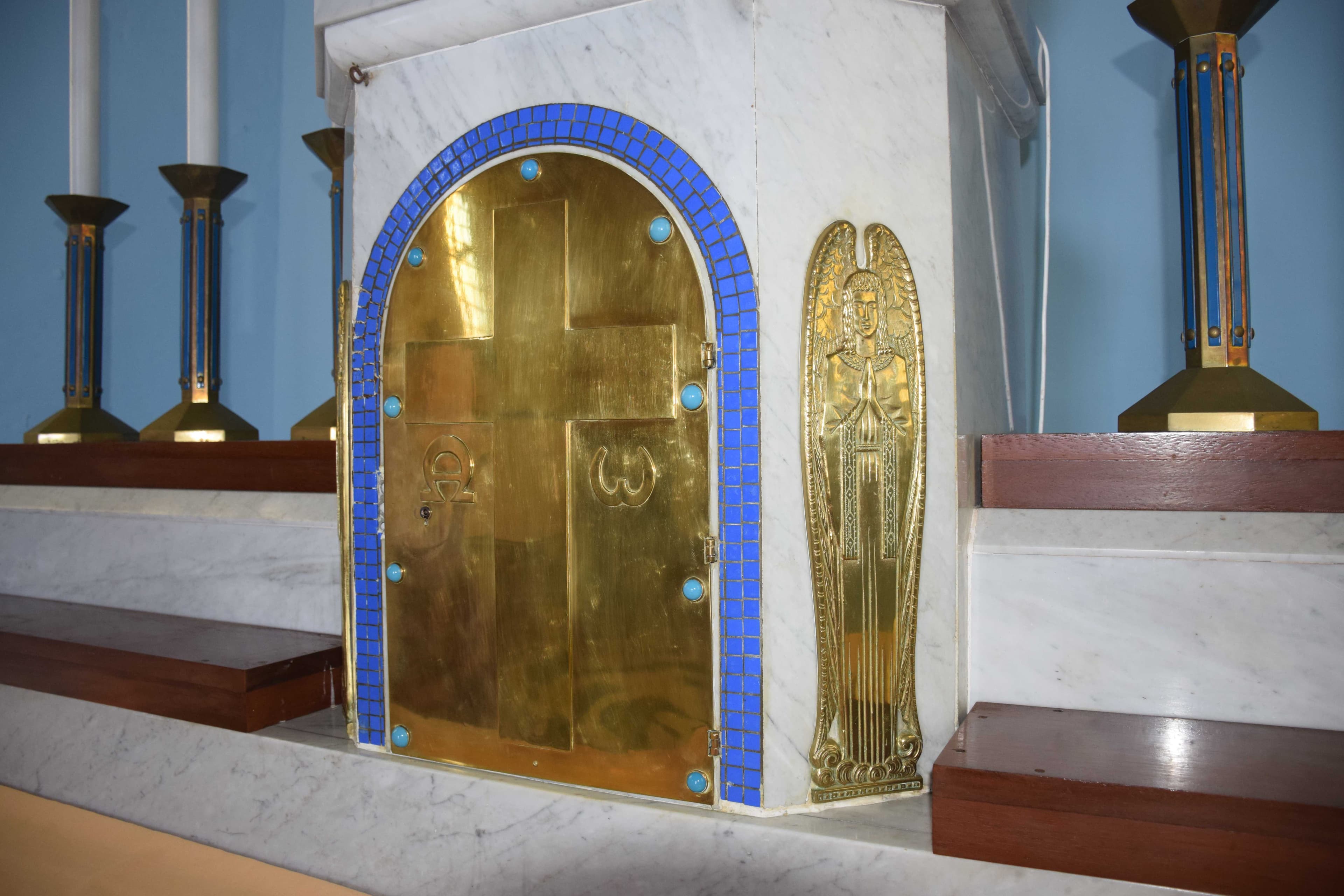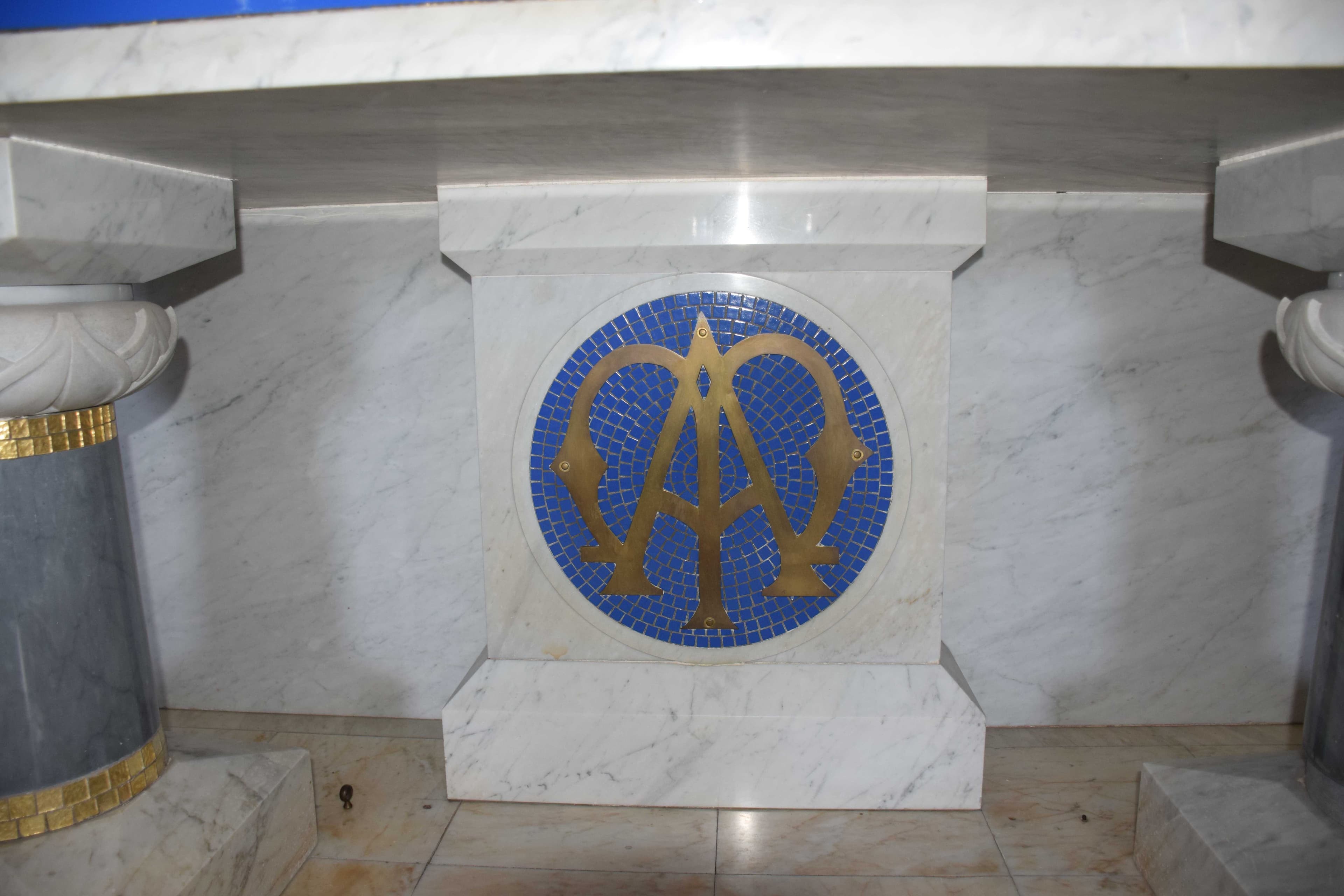 L'ensemble est conçu en béton recouvert de marbre gris clair ; L'autel est posé sur un socle à trois emmarchements. La table d'autel repose sur quatre colonnes en marbre d'un gris plus foncé, soulignées de carreaux de mosaÏques dorés, avec des chapiteaux sculptés de feuilles stylisées. AU centre une mosaïque circulaire sur fond bleu représente le monogramme marial en laiton doré (lettre AM entrelacées). Le tabernacle est fermé d'une plaque en cuivre doré ornée d'une croix. Deux autres plaques dorées figurant des anges stylisés sont appliquées sru les côtés. Ce décor rappelle un style à la jonction des influences Art nouveau et Art déco européennes. L'autel est surmonté de six chandeliers en métal doré, aujourd'hui électrifiés.