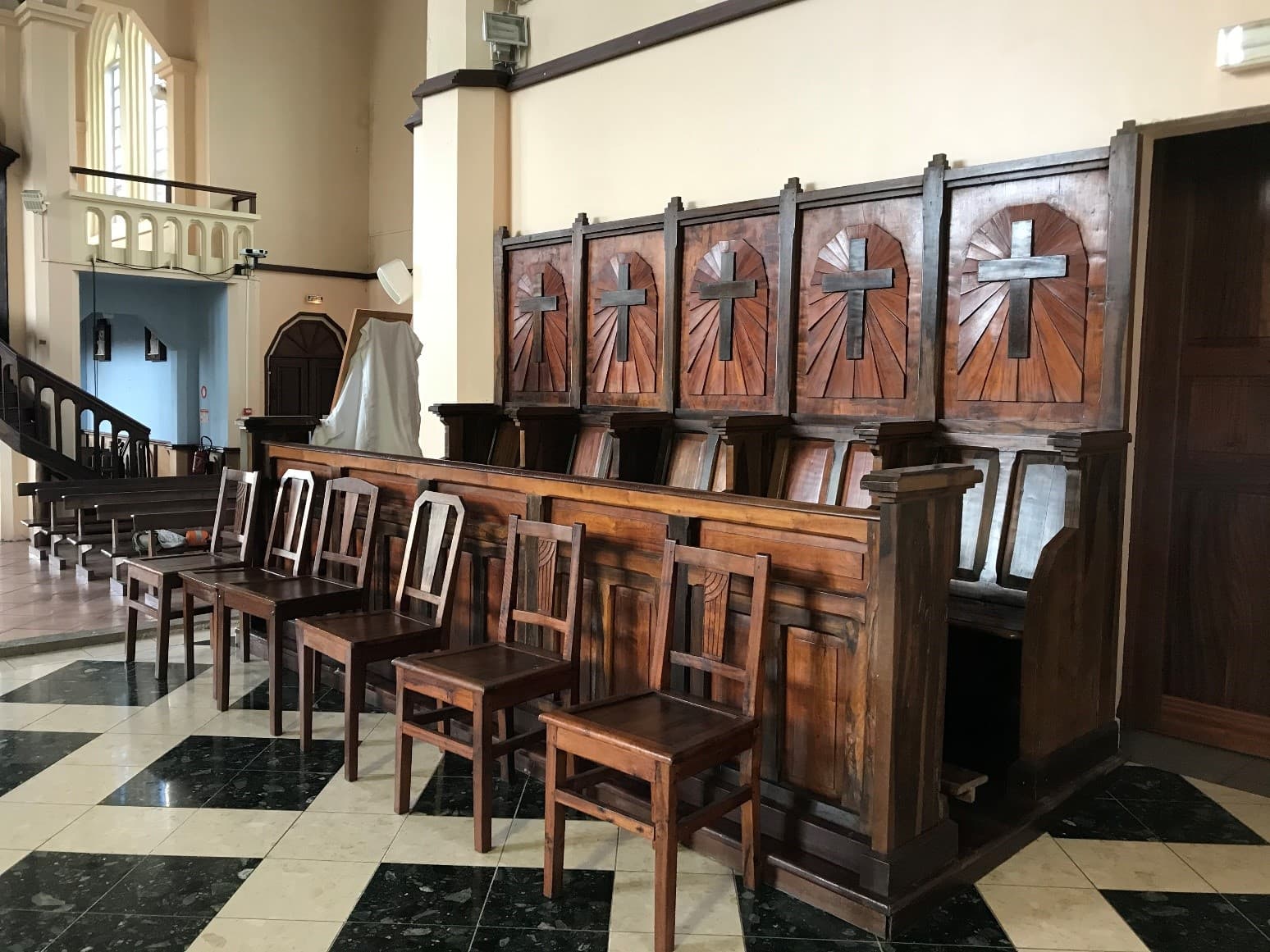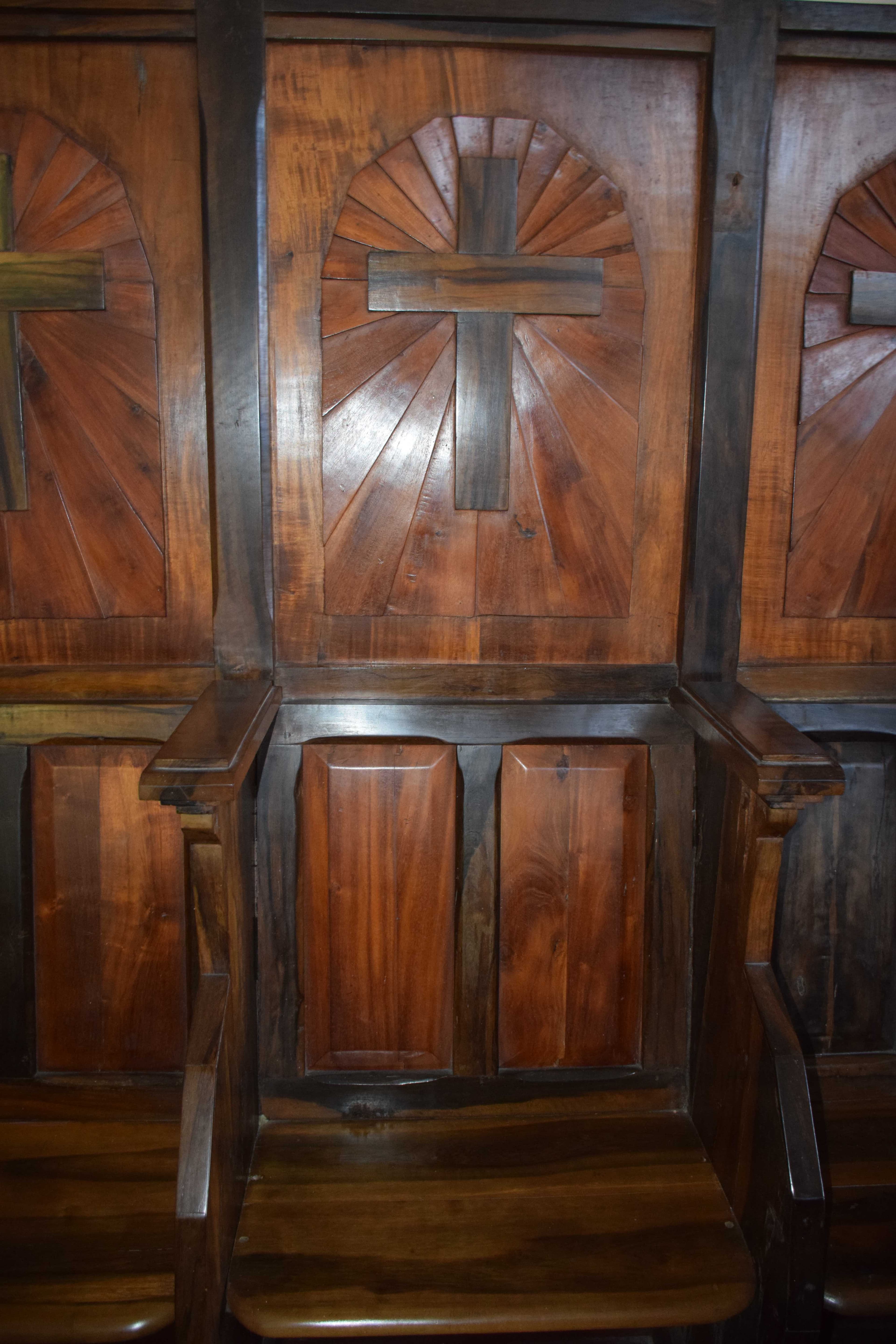 Ces ensembles sont réalisés localement bois de tamarin et bois d'olive avec quelques éléments en jacquier, ce qui permet un jeu avec les teintes des différents bois. Le décor de l'arrière des stalles reprend le motif de pans coupés présent dans tout l'édifice avec un assemblage rayonnant en bois de jacquier. En applique sur ce motif, se trouvent des croix fabriquées en bois d'olive. Les stalles à cinq sièges sont installées de chaque côté du choeur ; elles présentent un bon état de conservation.