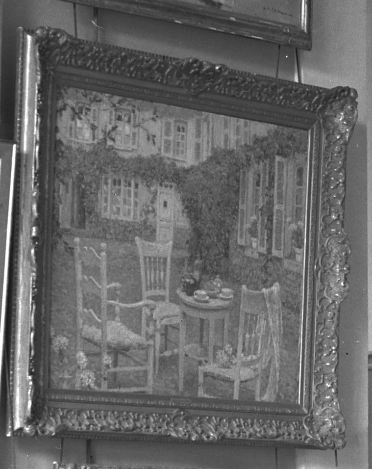 Extrait traduction transmise par R. Valland : "18. Le Sidaner, Table mise dans le jardin, h. sur t., enc., 73 x 93 cm".
