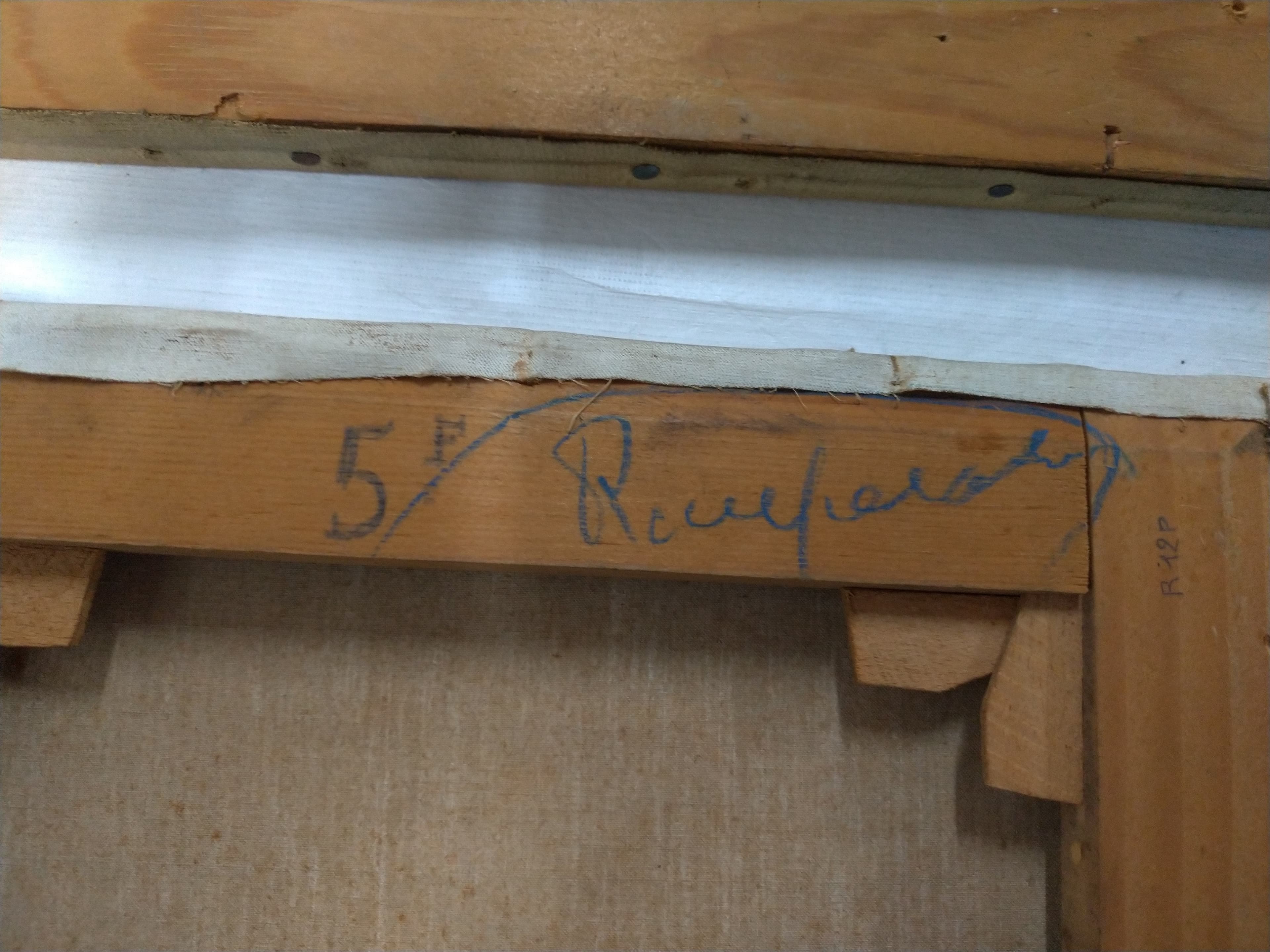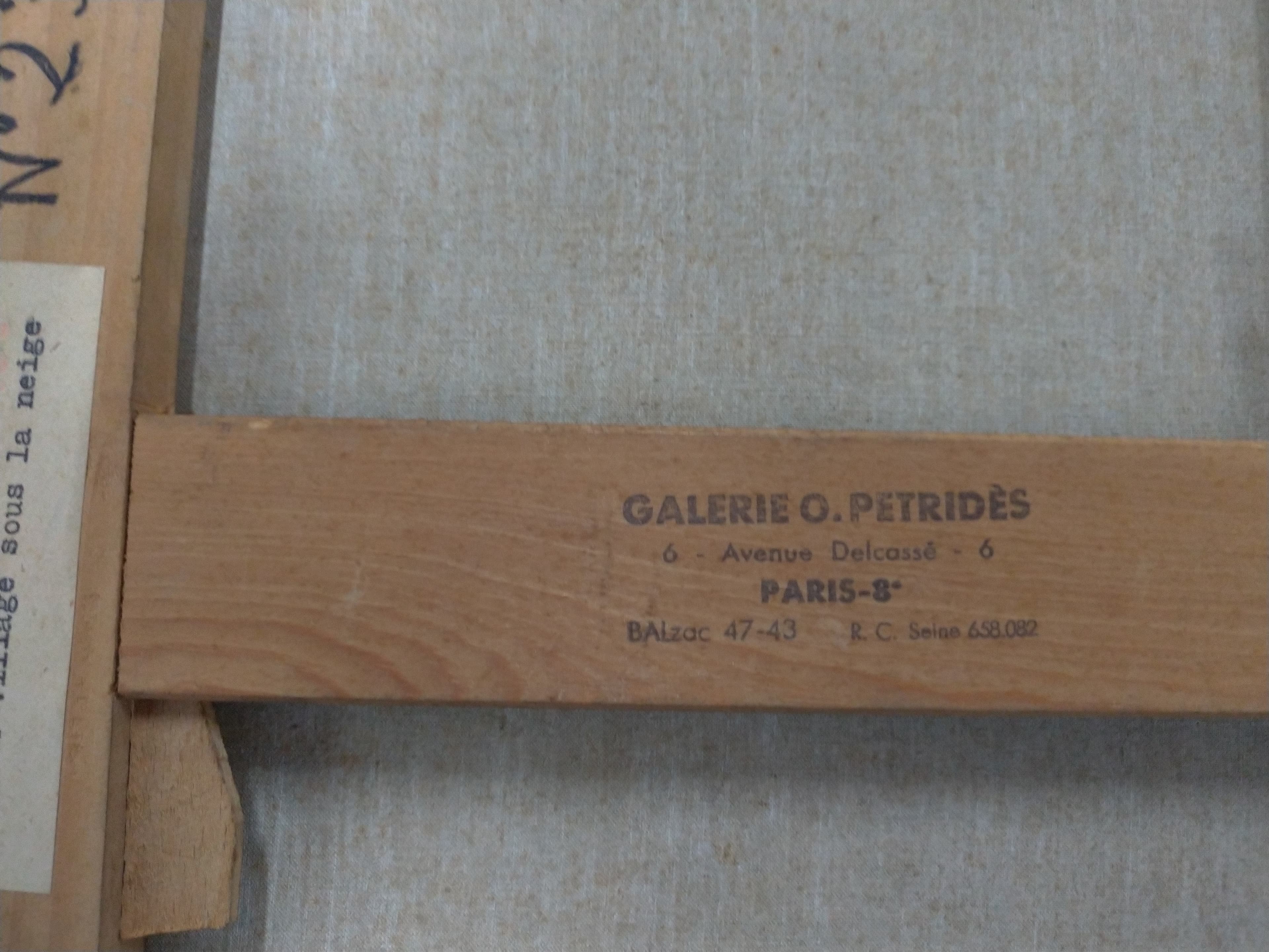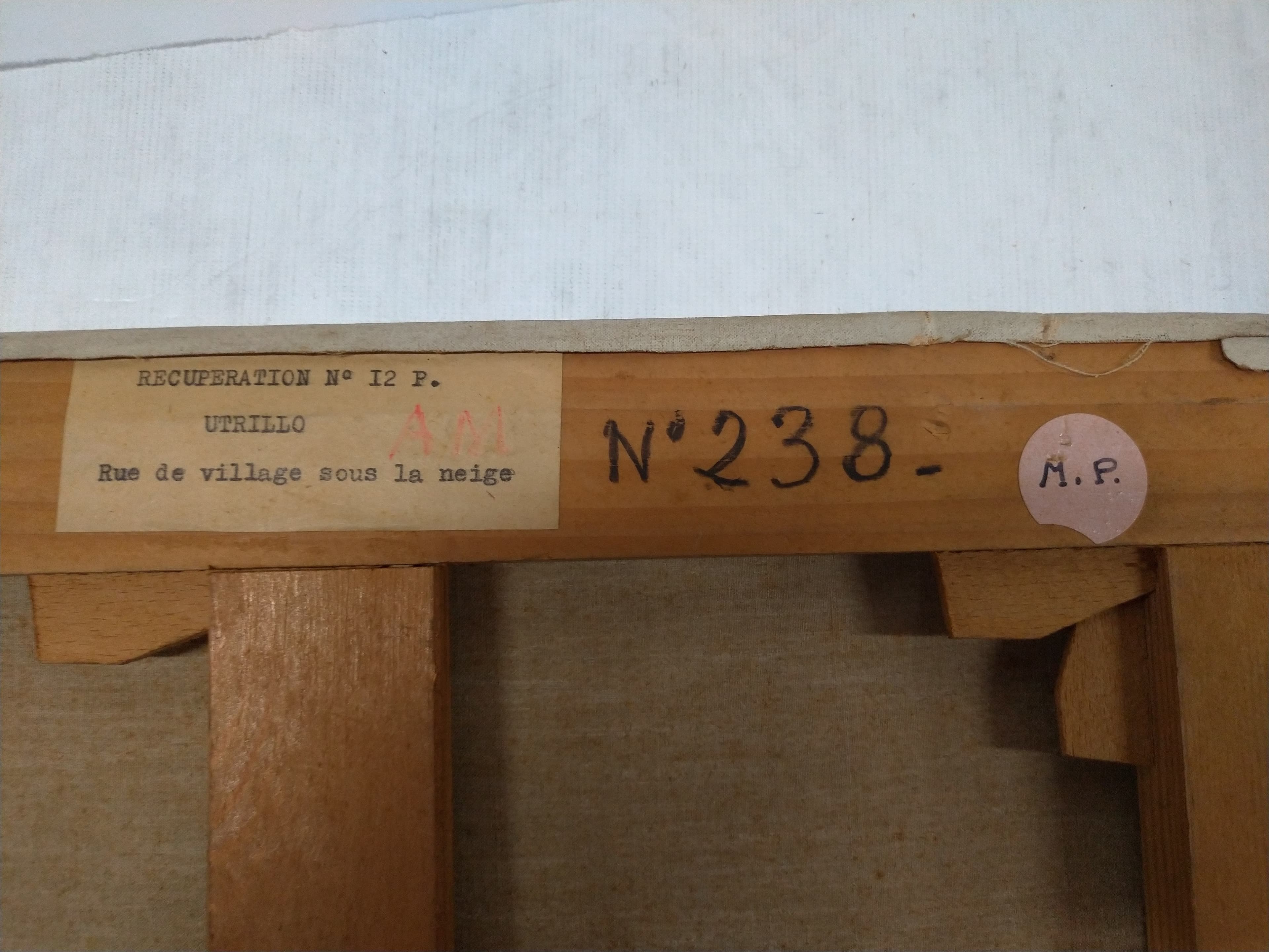 Sur le châssis : A la main au crayon noir "5F" ; à la main au crayon bleu "Récupération" ; à la main, au feutre noir : "MUSÉE D'ALBI" et "N° 238" ; étiquette : "Récupération n° 12 P/UTRILLO/Rue de village sous la neige" ajouté au crayon rouge : "AM" ; étiquette ronde rose, à la main, au feutre noir "M. P." ; étiquette "Maurice ROBINOT/ Emballage d'objets d'art / 9 rue Sédillot, 9 Paris/ Musée d'Albi / Musée d'Art moderne" (étiquette détériorée) ; sur traverse du châssis, estampillé en noir : " Galerie O. Pétridès/6, avenue Delcassé 6/Paris-8ème/BALzac 47-43 R.C. Seine 65082".