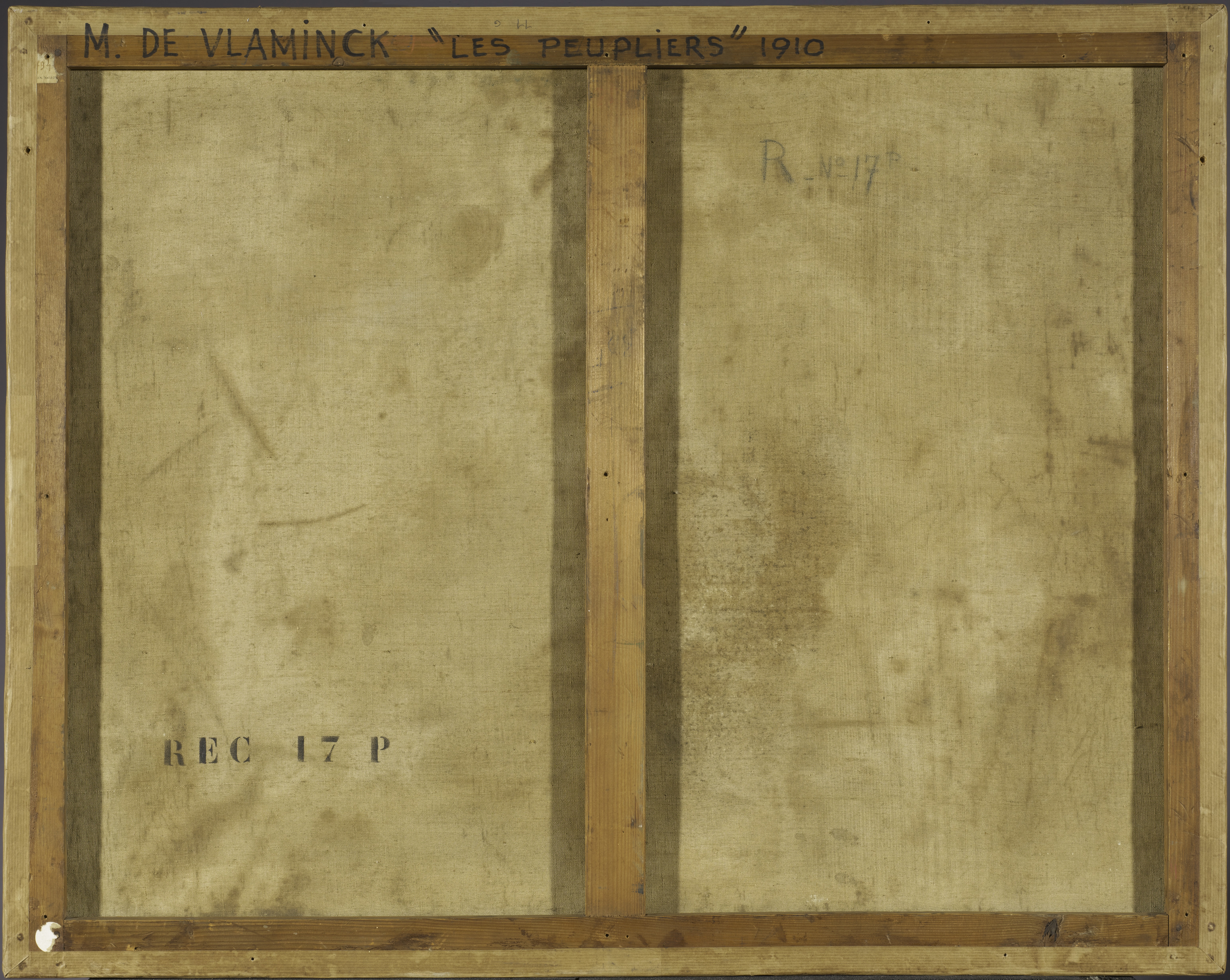 Sur la toile : au crayon de graphite "R-N° 17 p" ; au pochoir en noir "REC 17 P".
