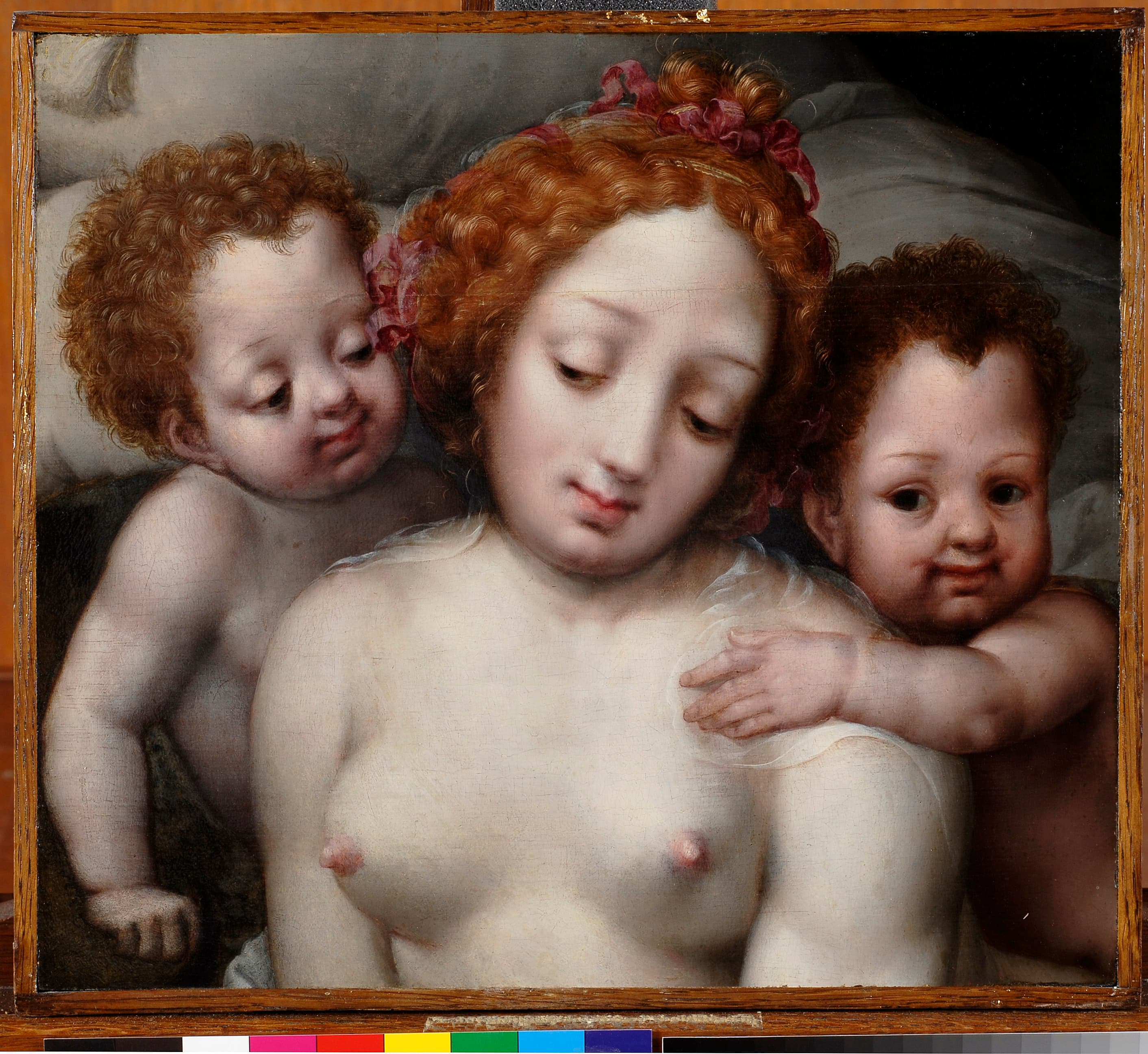 Au revers du panneau, sur étiquette à liseré bleu : MNR / 18 / École française XVI / Vénus et l'amours [sic] ;