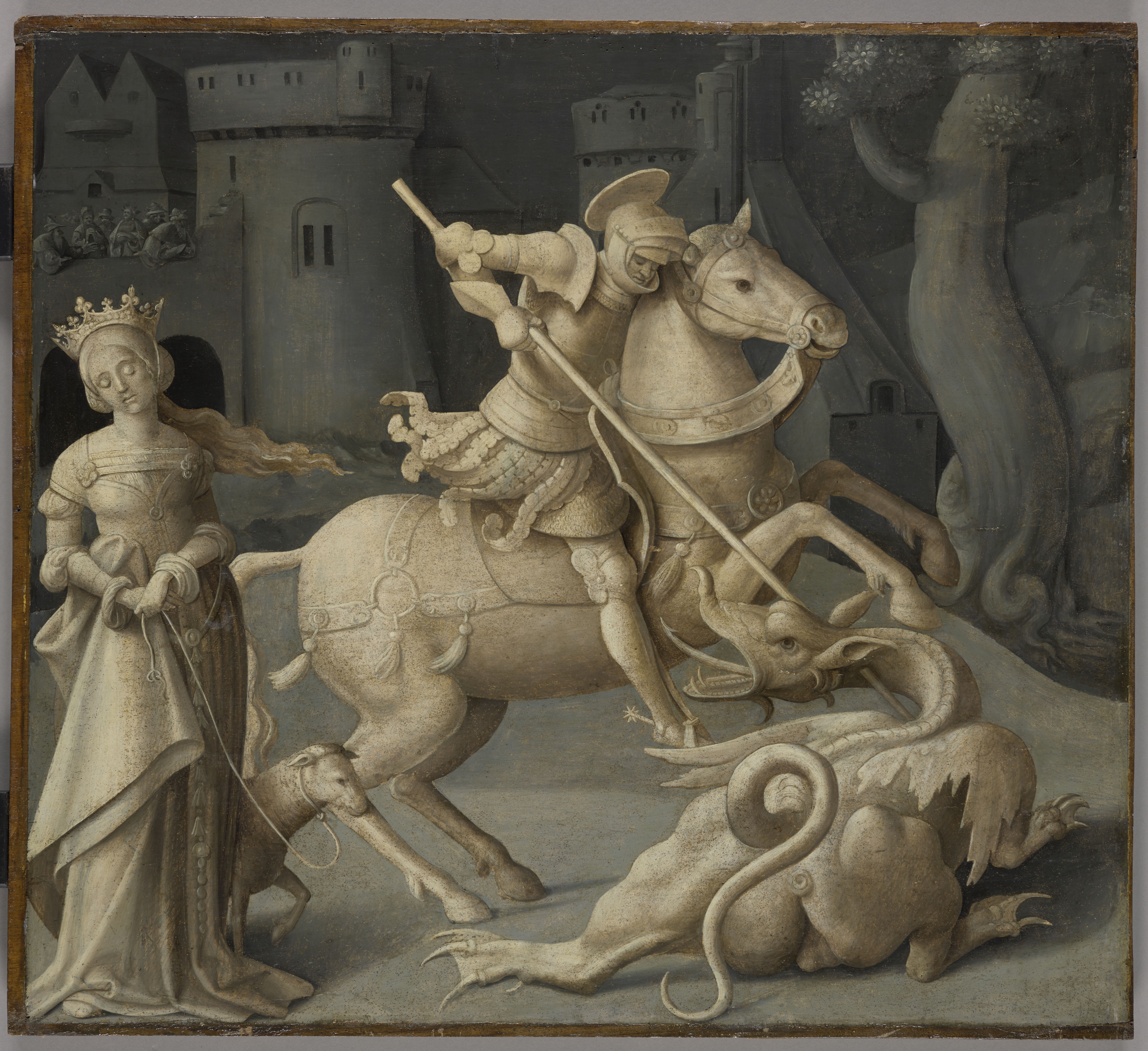 scène (saint Georges, combat, dragon, armure, cheval, Trébizonde princesse de, couronne, mouton, secours) ; fond de paysage (feuillu, château, personnage)