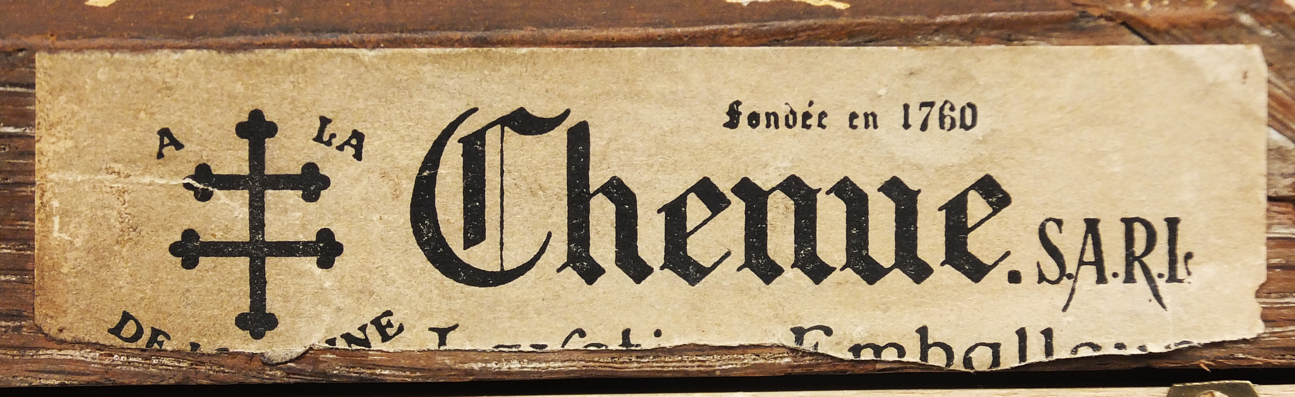 -Montant supérieur : Étiquette rectangulaire « Fondée en 1760/Chenue.SARL/Layetier emballeur/... » et « A la (monogramme) Croix/de Lorraine ».