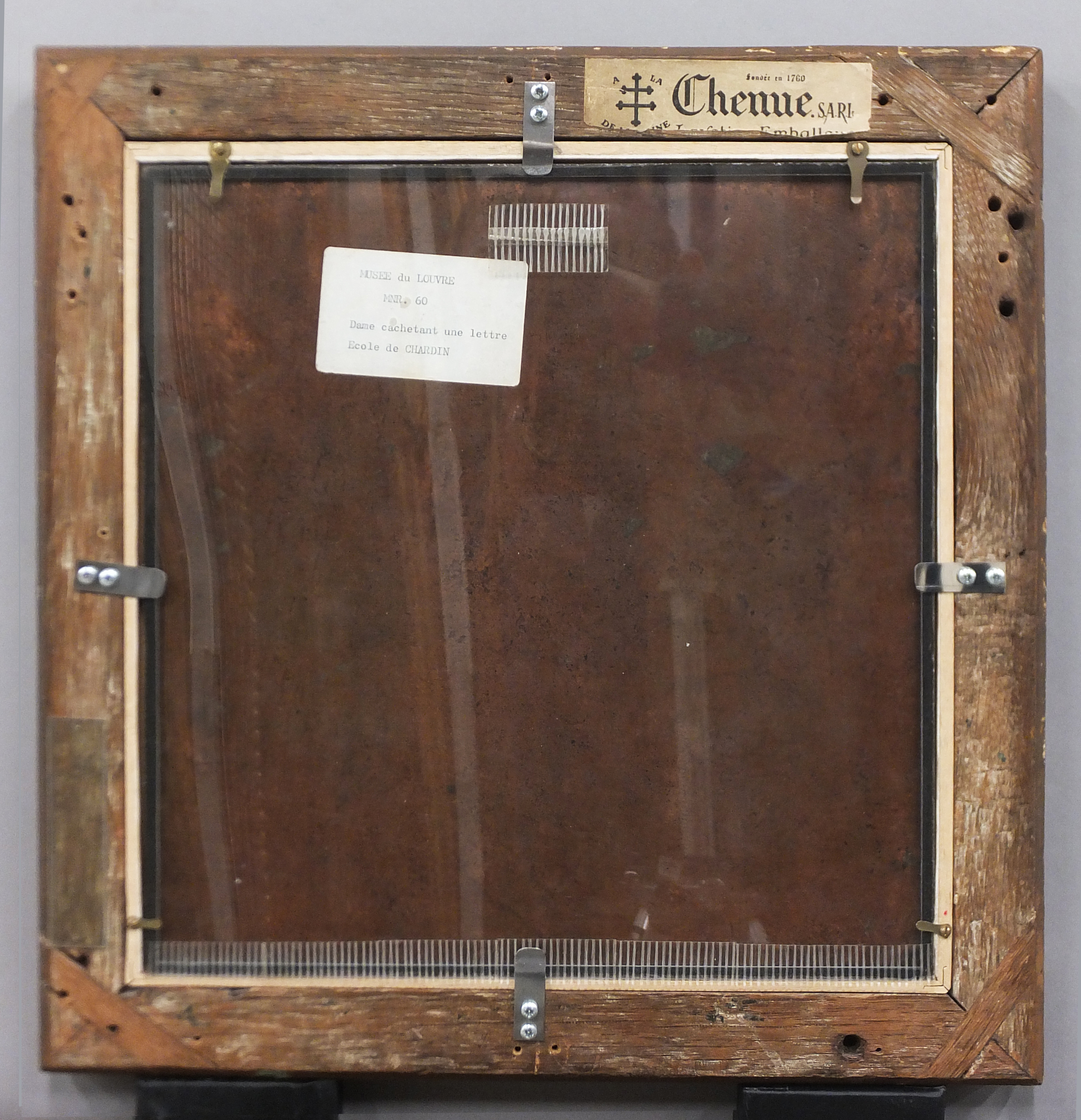 -Sur le panneau en cuivre : Étiquette rectangulaire à coins arrondis « Musée du Louvre/MNR 60/Dame cachetant une lettre/École de Chardin ».