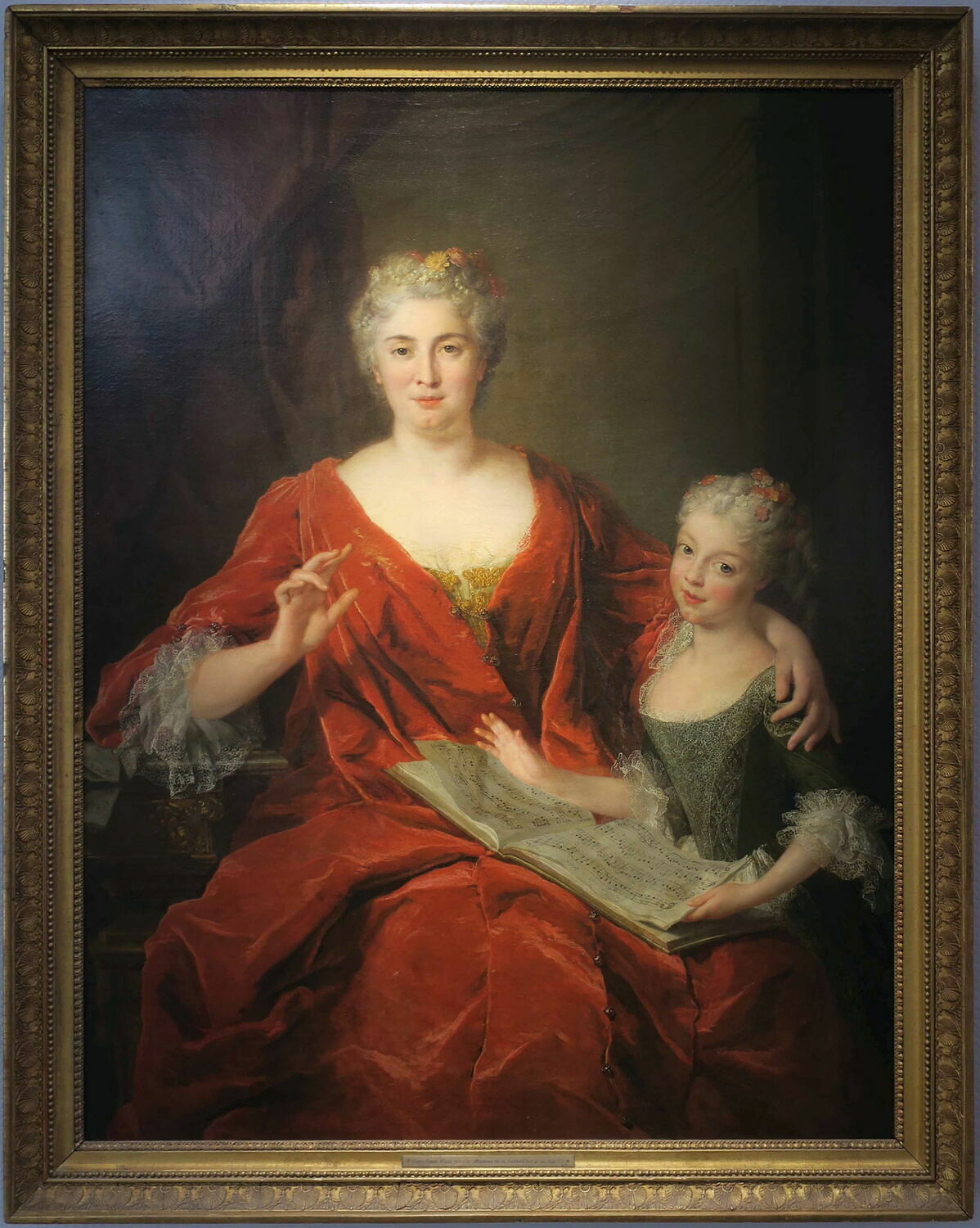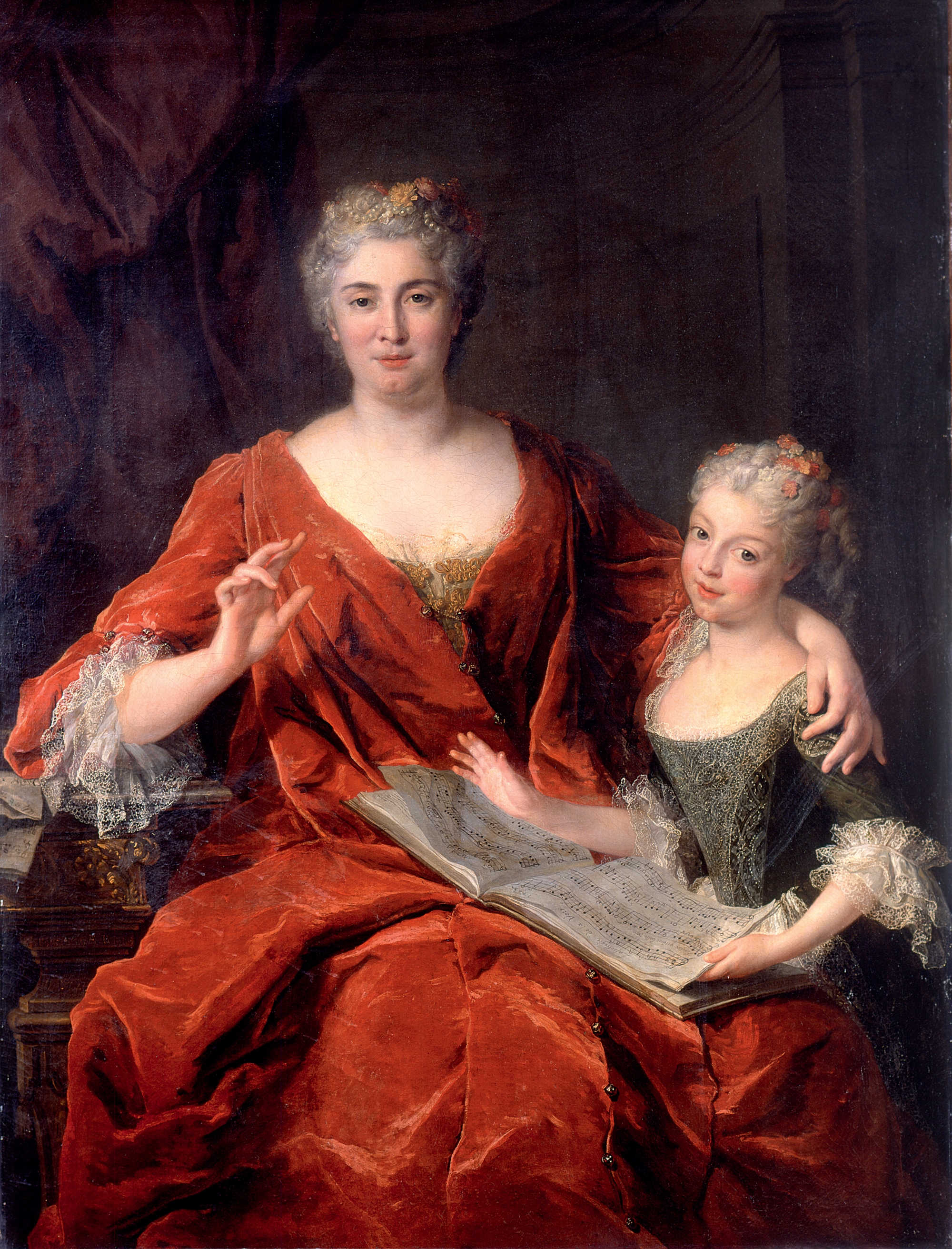 Une dame, des perles dans les cheveux, est assise de face dans un vêtement de velours. Sa main droite semble battre la mesure, le bras gauche entoure les épaules d'une petite fille, la tête inclinée, des fleurs dans les cheveux. Corsages décolletés, manches de dentelle. Elles tiennent sur les genoux un cahier de musique "Dornel L'Apollogie (sic) de la voix 1723"
