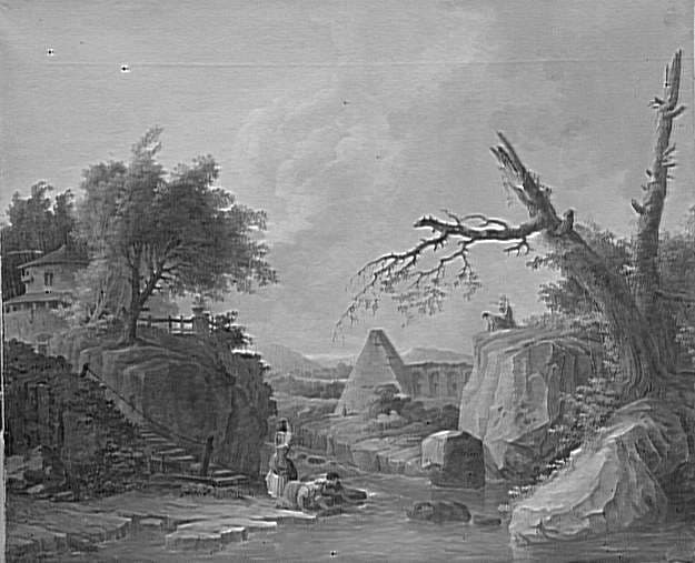 Étiquette "Galerie Maria Dietrich/"Almas"/München 2 Ottostrasse/Hubert Robert 180/156" ; étiquette "MNR 90/Hubert Robert/Paysage avec pyramide" ; étiquette "2234/998" ; étiquette "MNR 90/Compiègne/Hubert Robert" ; étiquette "K.I.126".