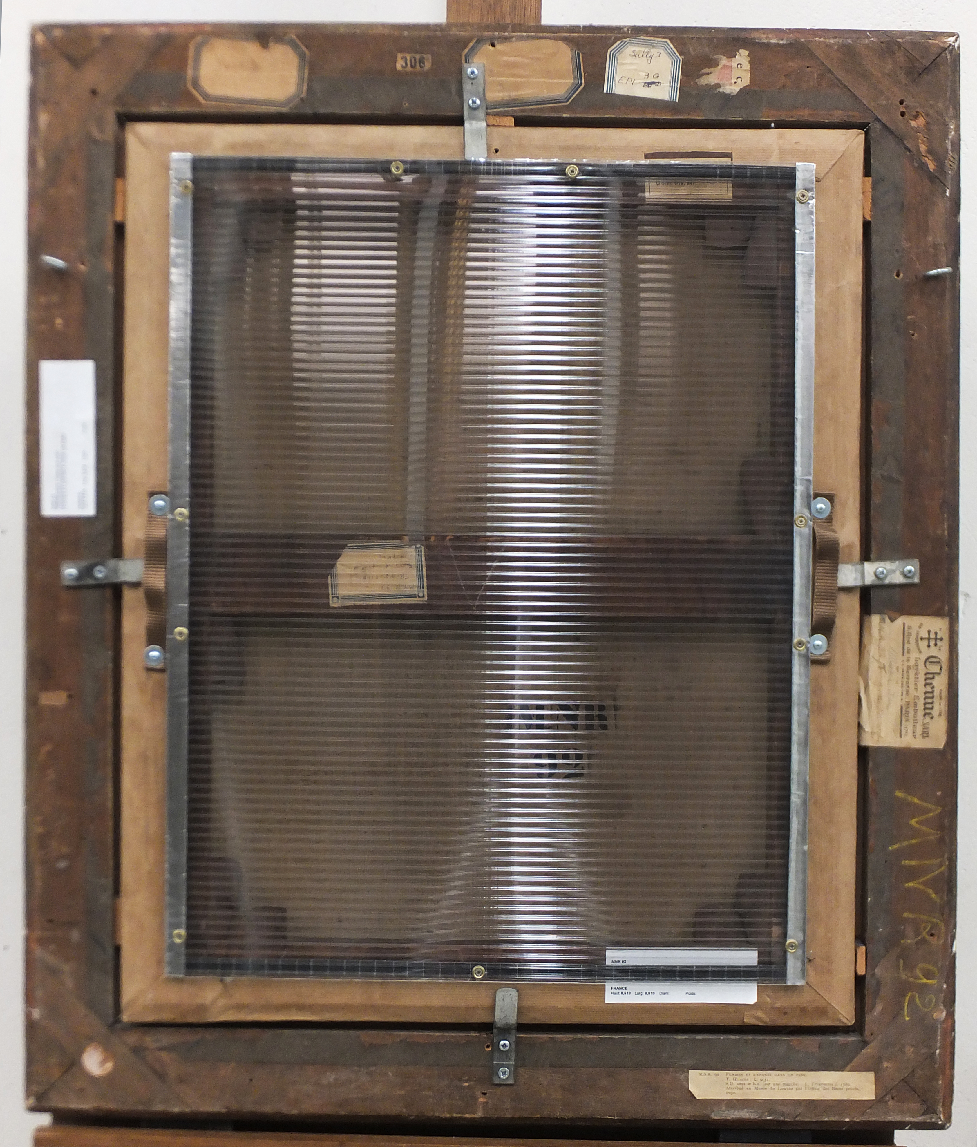 -Montant supérieur : A la craie rouge, inscription masquée par le papier de bordage ; étiquette rectangulaire à listel noir « Kaiser Wilhem-Museum, Krefeld/Gem. Inv. Nr 212 ».