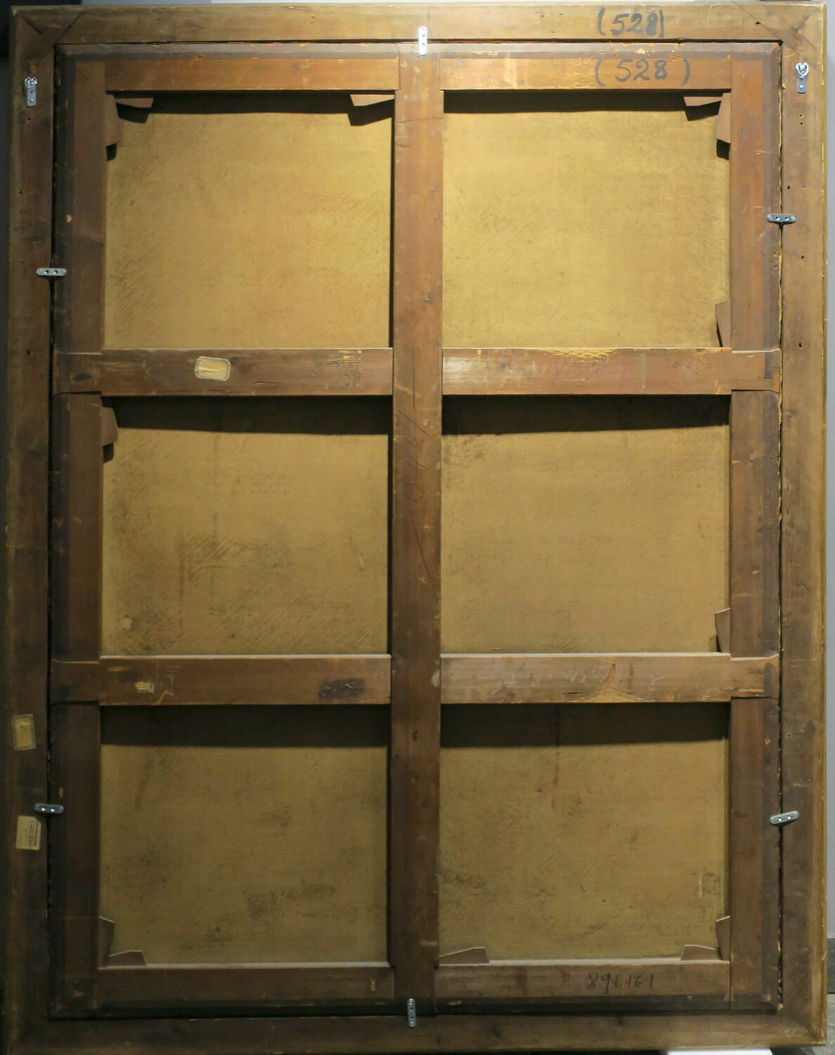 Sur le châssis : Au pinceau noir "528" ; en blanc "Reste (?)" ; à la craie rouge "DYCK 462" ; gravé "D 52-2-2" ; au feutre noir "891-16-1" ; au crayon "-0407-" ; "Pau 891-161" ; "L'escarpolette" "MNR 105/Trinquesse".