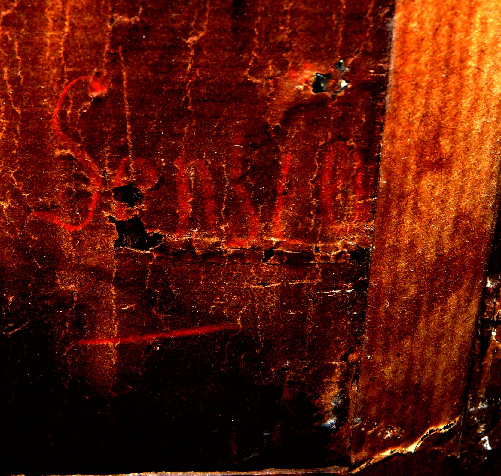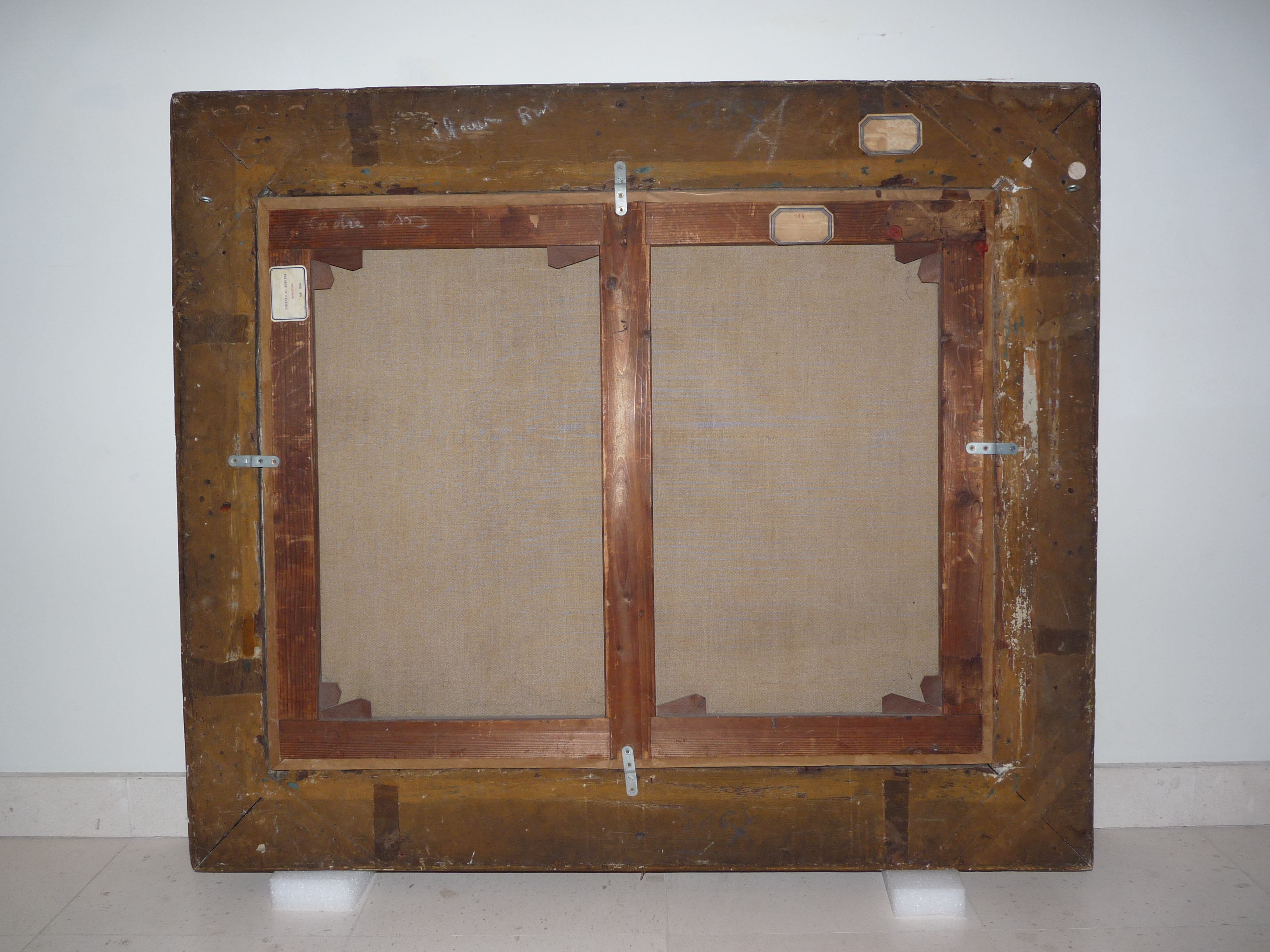 Sur le cadre : au crayon bleu, deux fois (en haut et en bas) « 5867 » ; étiquette rectangulaire coupée en deux à coins coupés et liseré bleu « ... (illisible) » ; étiquette ronde blanche.