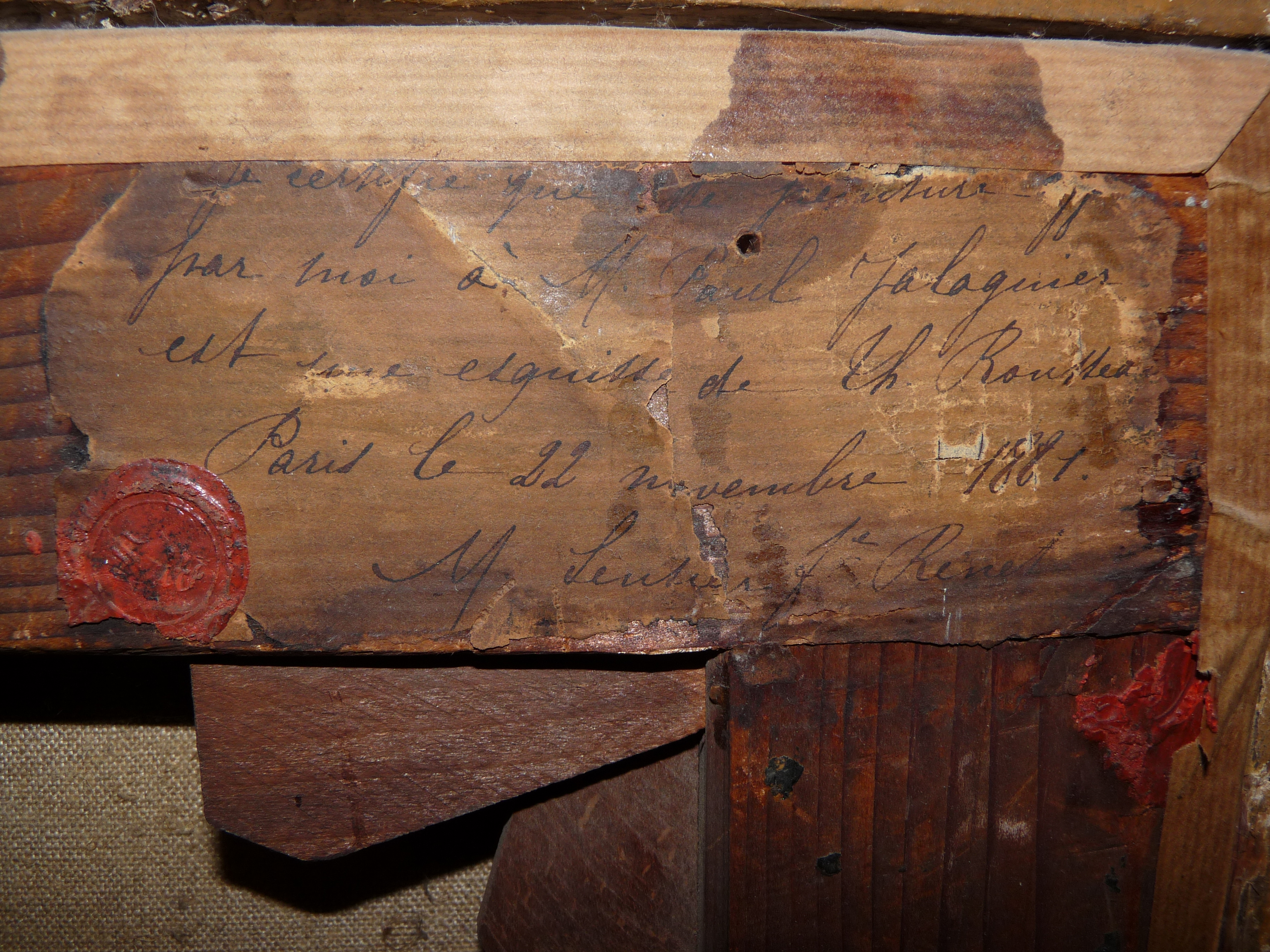 -Montant supérieur : A la craie blanche « cadre ass » ; étiquette rectangulaire à pans coupés à liserés bleus « MNR 164/Rousseau/Paysage de rivière/224 » ; étiquette ancienne rectangulaire avec cachet de cire notarial illisible « Je certifie que cette peinture offerte/par moi M. Paul Jalaguier/est une esquisse de Th. Rousseau/Paris le 22 novembre 1881/M. Sensier fe Renet ».