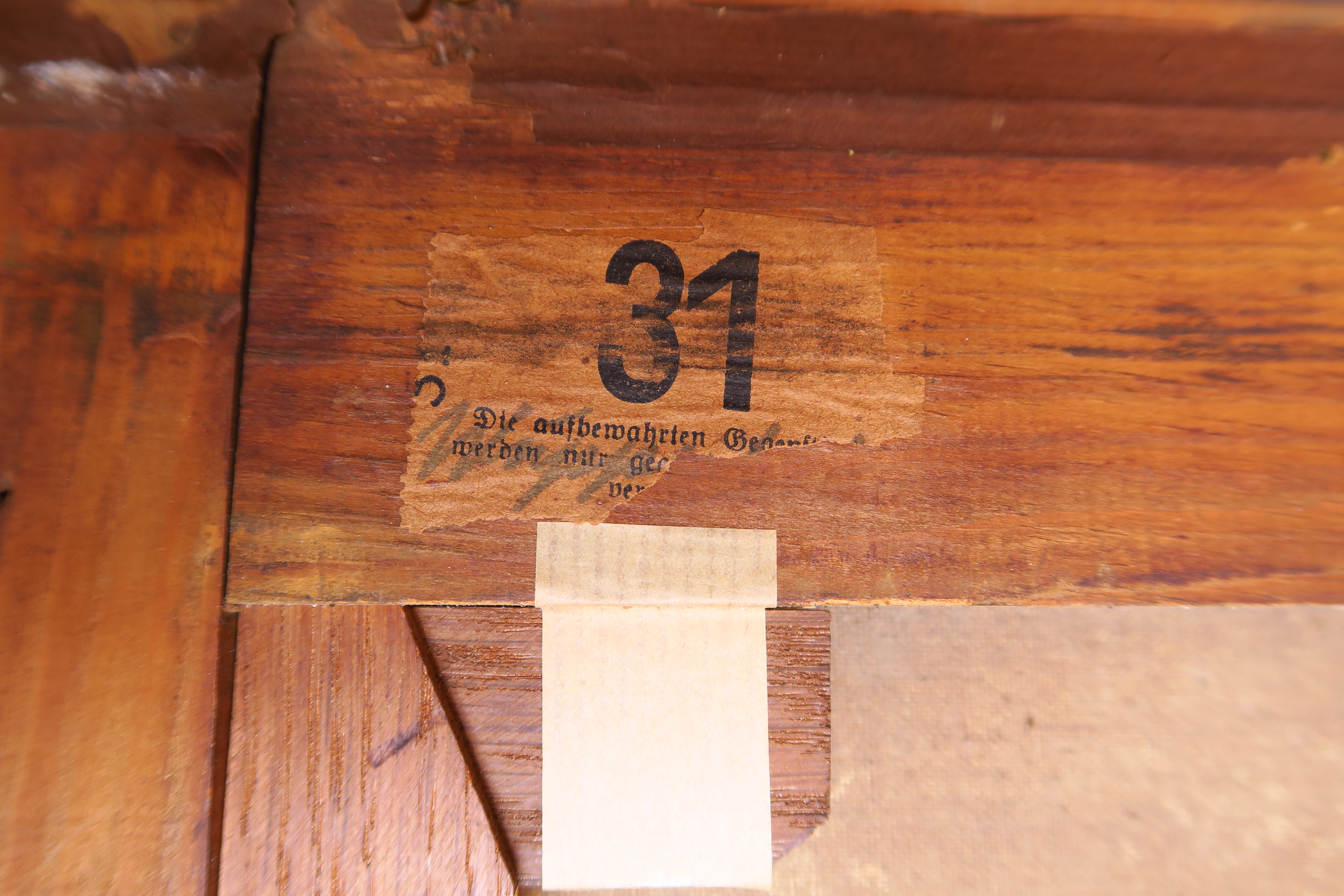-Montant inférieur : Étiquette rectangulaire (prédécoupée) « 11592 » ; étiquette rectangulaire « 31 » et inscription en allemand « Die aufbewahrten Gegenstände/werden nur gegen diesen Schein/[ver]abfogt ».