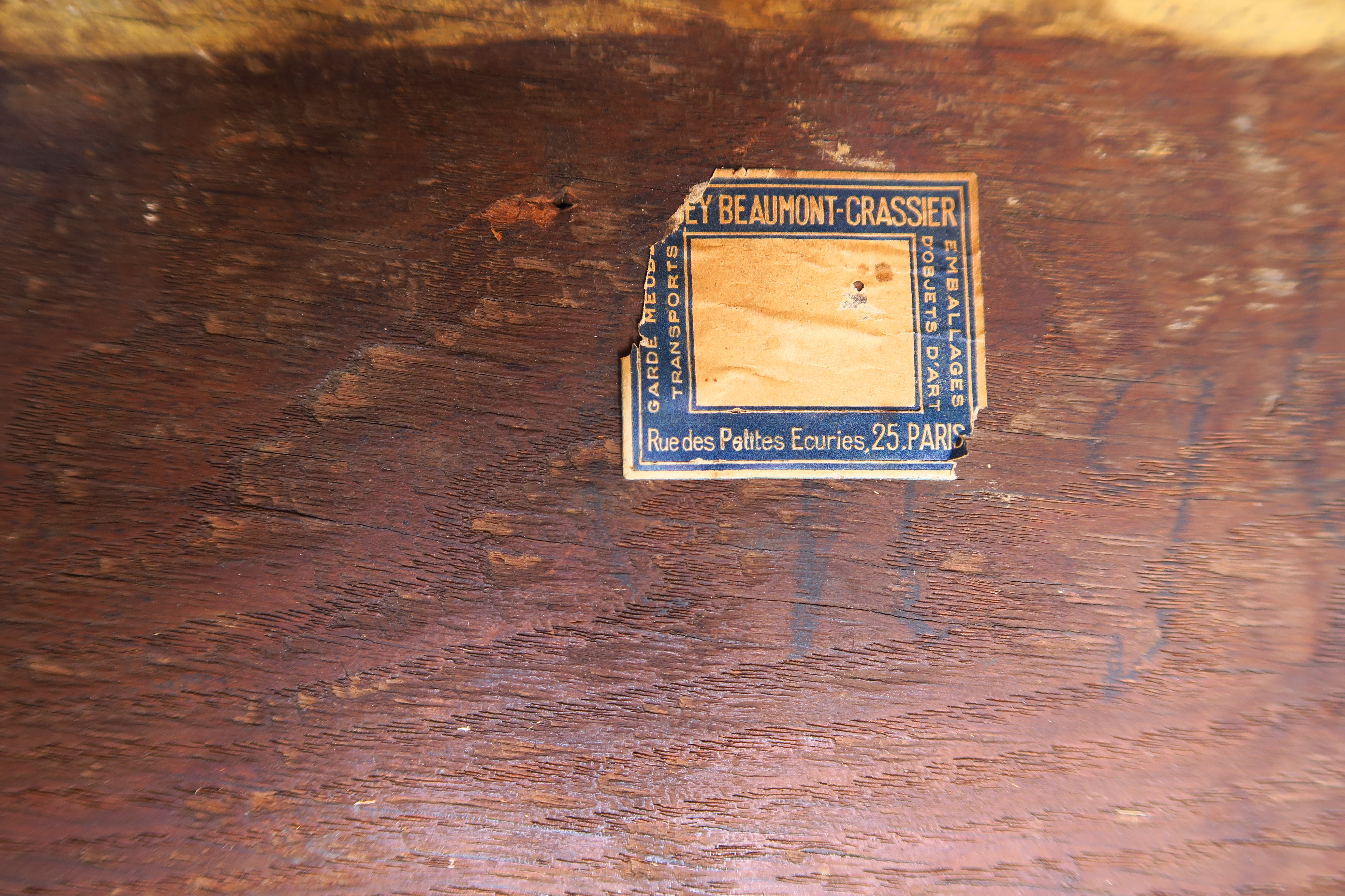 -Montant inférieur : Étiquette carrée bordée d'inscriptions bleues « [Puse]y Beaumont-Crassier/rue des Petites Écuries 25 Paris/Garde-meuble/Transports/Emballages/d'Objets d'art » ; inscription illisible « N° 9 ...» (?).