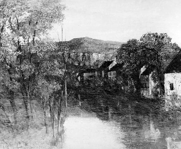 paysage (village, Ornans, maison, rivière, reflet, feuillu, colline)