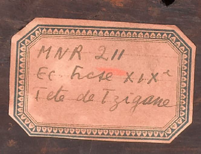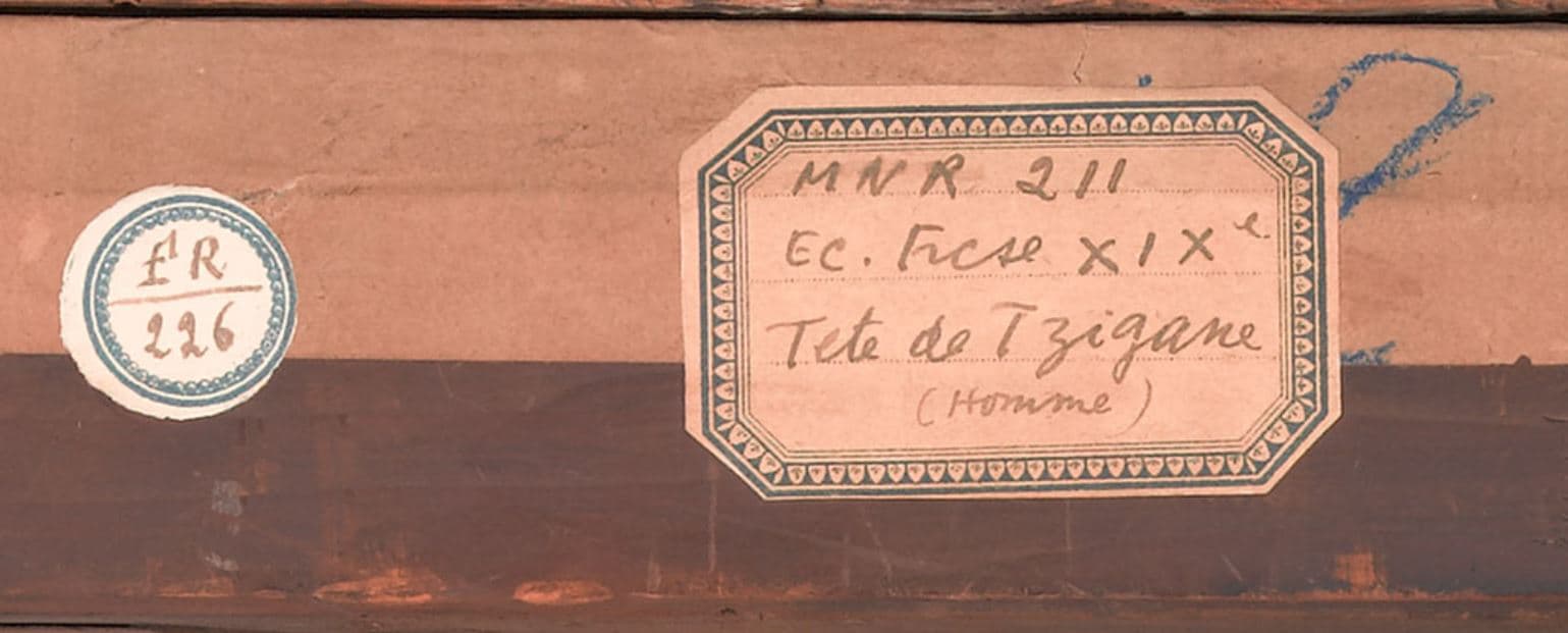 -Montant gauche : Étiquette rectangulaire bordée de bleu : « MNR 211/ÉCOLE FRANÇAISE (biffée) XIX° S/ÉCOLE INDETERMINEE/TÊTE D'HOMME TZIGANE ».