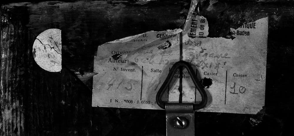 -Montant supérieur : En haut à gauche, étiquette ronde « 226 » ; étiquette rectangulaire « ... Origine : Tête de Tzigane/Auteur : école française XIX°/Nr Inventaire 415-Salle : VI - Étagère ou Mur : est -Casier ... caisse 10 » (Étiquette du Central Collecting Point de Baden-Baden) ; étiquette rectangulaire bordée d'oves « MNR 211 / Ec. Frcse XIX°/Tête de tzigane » ; deux fragments d'étiquettes ; étiquette rectangulaire « MNR 211/Anonyme (XIXème)/Portrait d'homme » ; inscription craie blanche « A ».