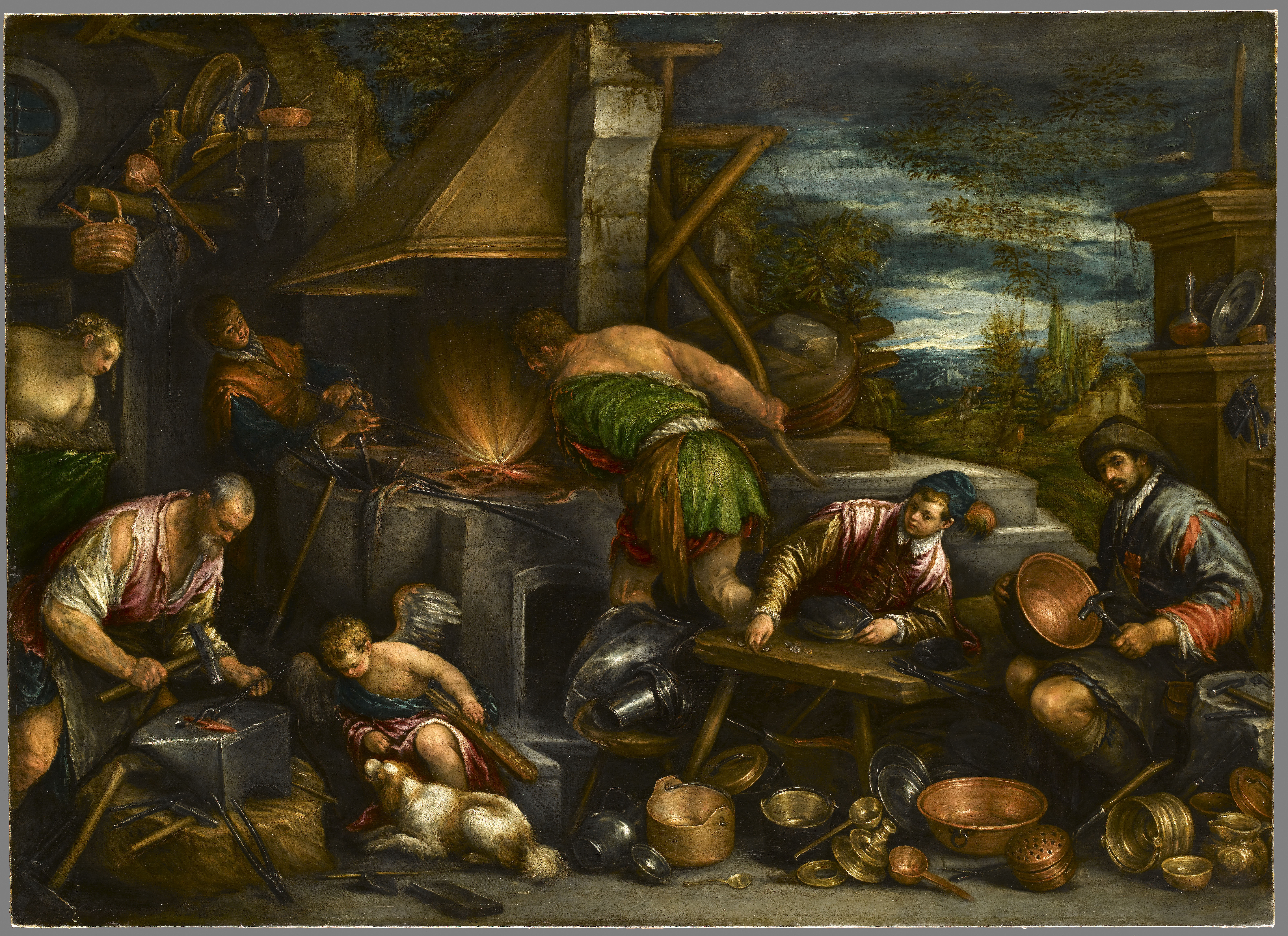 scène mythologique (forgeage, Vulcain, Cupidon, Vénus, ?, chien, vaisselle, bassinoire, bassin, récipient pour la consommation, outil) ; fond de paysage