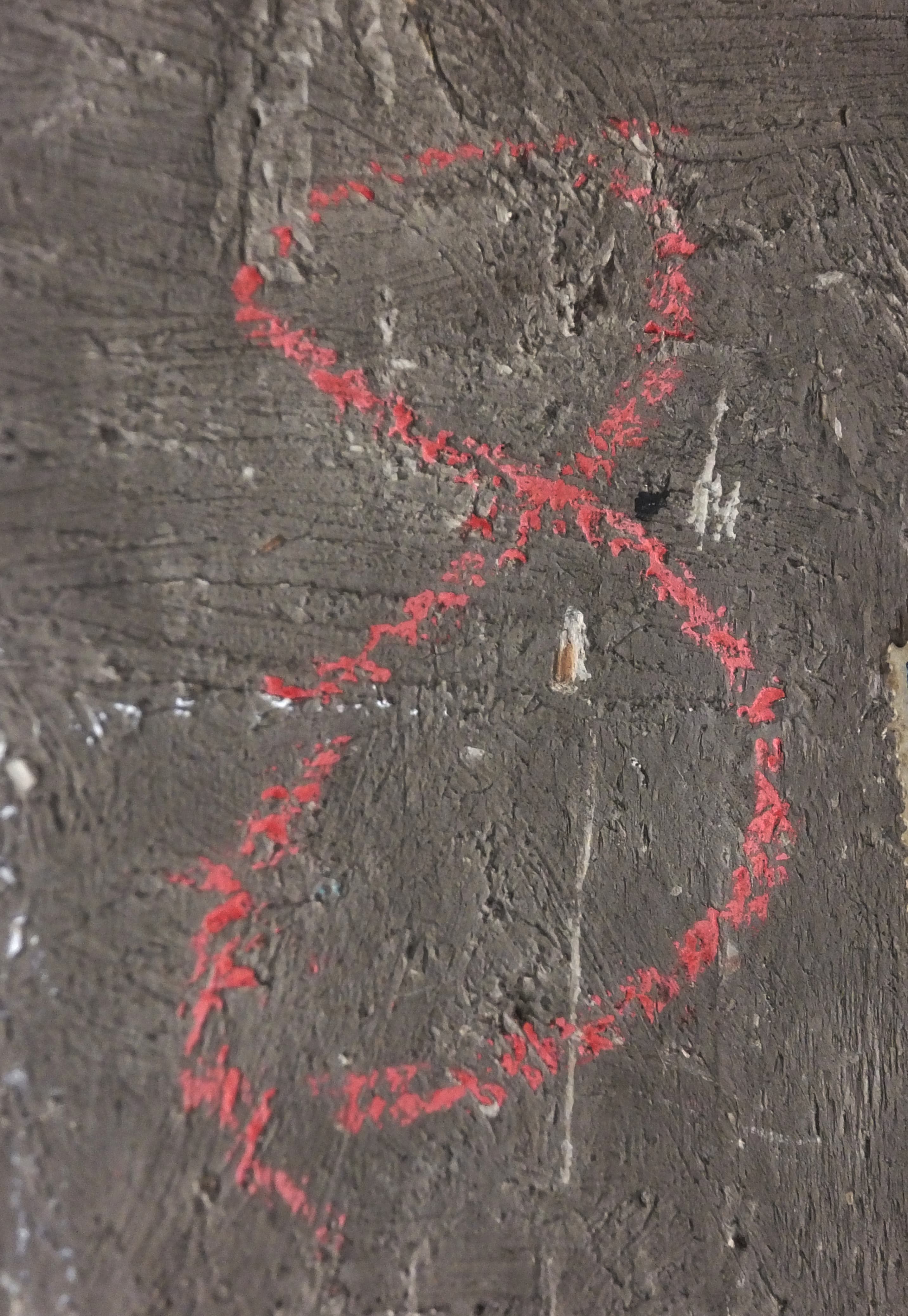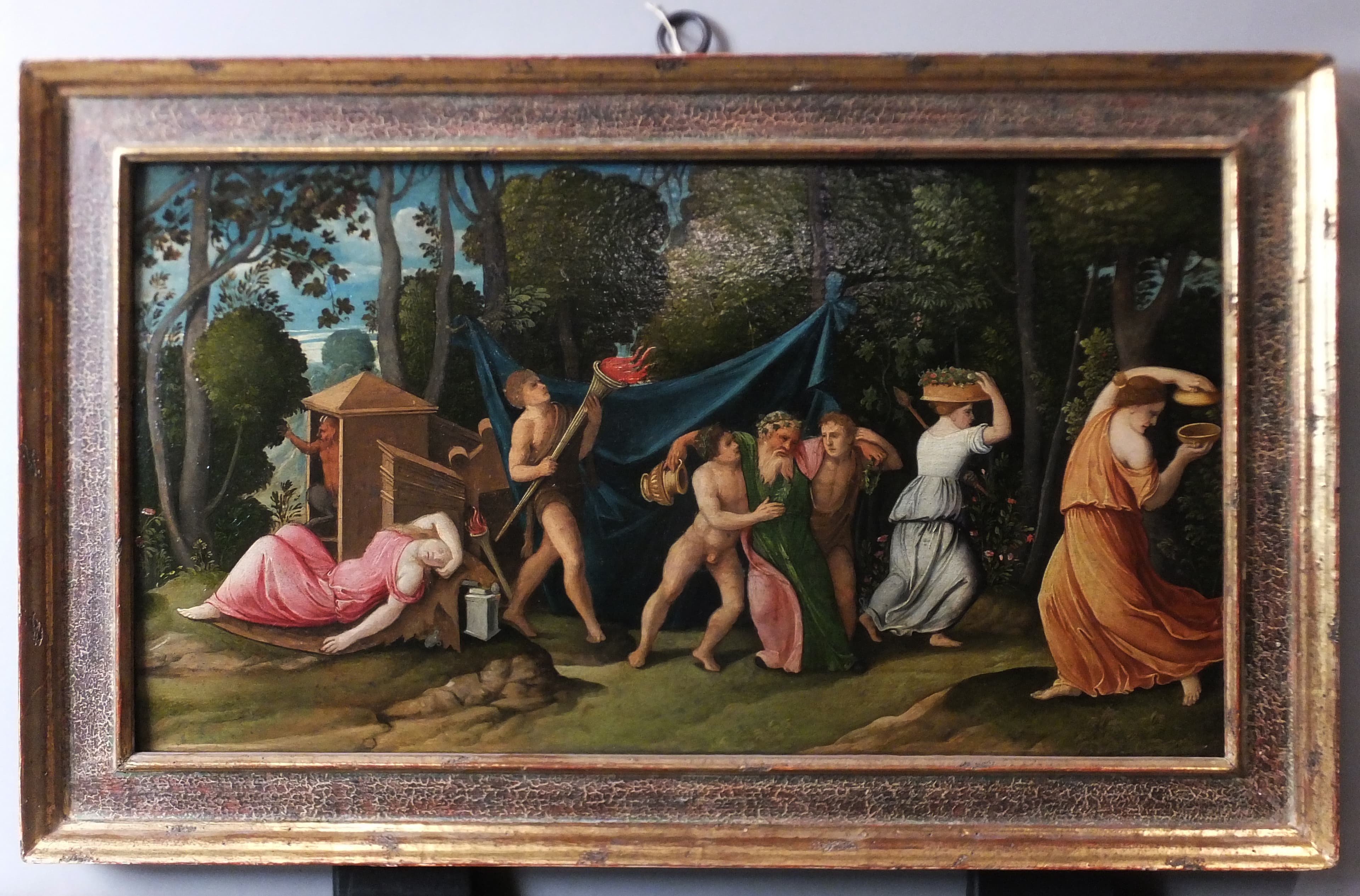 Au revers du panneau : Au tampon noir "MNR 262" ; à la craie blanche "2 (?)" ; à la craie bleue "9893" ; à la craie rouge "8" ; étiquette rectangulaire avec tampon ovale "Galleria/ Manfrin. G Manfrin" ; étiquette rectangulaire avec tampon ovale très effacé "N° ... (?) ; étiquette rectangulaire à bord dentelé et listel bleu orné d'un rang d'oves et cabochons "3368" ; étiquette rectangulaire à coins coupés et listel bleu "It/92" ; étiquette rectangulaire à coins coupés et listel bleu "MNR 262/Italie XVI° (biffé) Vénétie Deb XVI°/Bacchanale/... (au crayon rouge illisible)" ; étiquette rectangulaire "MNR 262/Italie XVI°?/Bacchanale/Italie (Vénétie)/Haut. : 0,285 Larg. : 0,500 Diam. Poids" ; étiquette noire attachée "18 Vénétie Bacchanale" ; étiquette rectangulaire à coins coupés attachée "Shipped by/ Sté Nouvelle Atlantic/International Forwarding Agents/62, rue Mirabeau/94200 Ivry (France)/'Sea on Back' Tél. 672 74 36".
