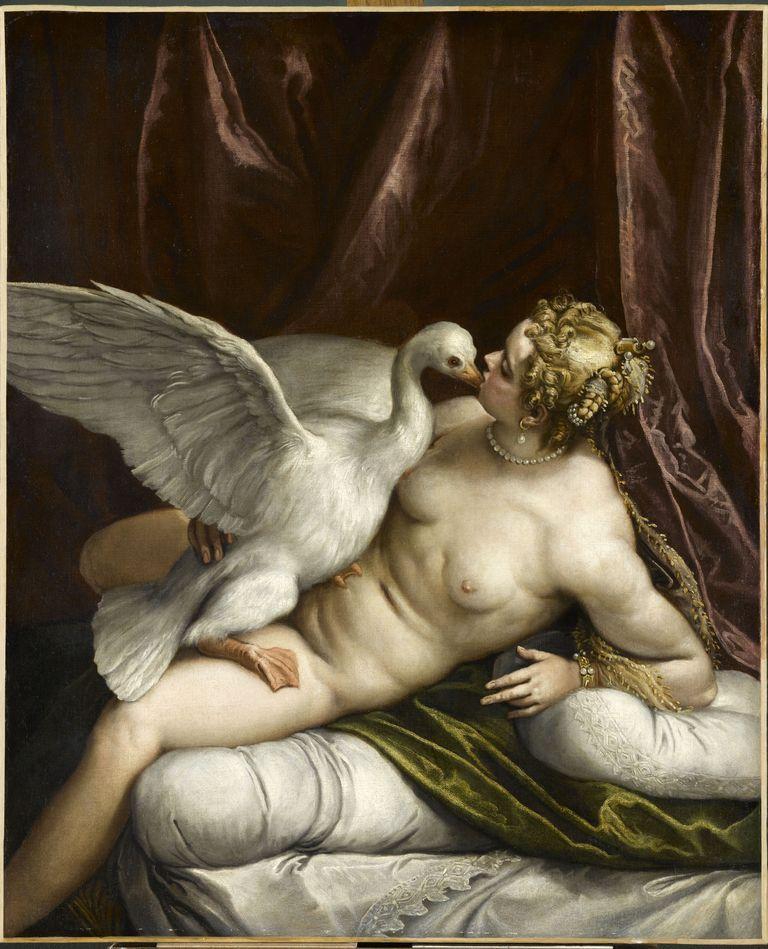 scène mythologique (Léda : nu, Jupiter, représenté en : cygne, métamorphose, amour, relation sexuelle, effet de tissu, draperie, coussin, bijou, coiffure)
