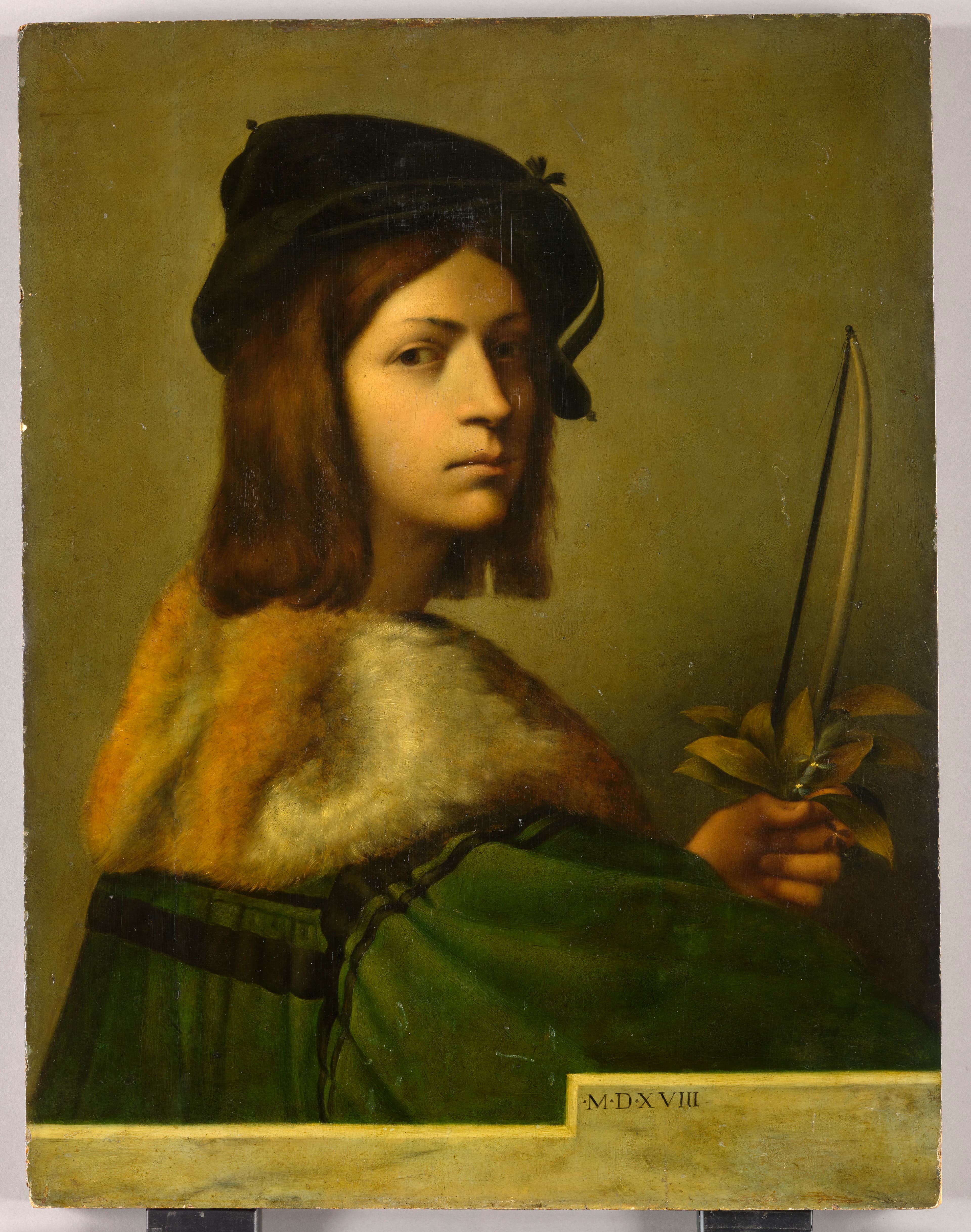 portrait d'inconnu (homme, en buste, de trois-quarts, violon : partie de, feuille : laurier, musicien, ?, fourrure, couvre-chef)