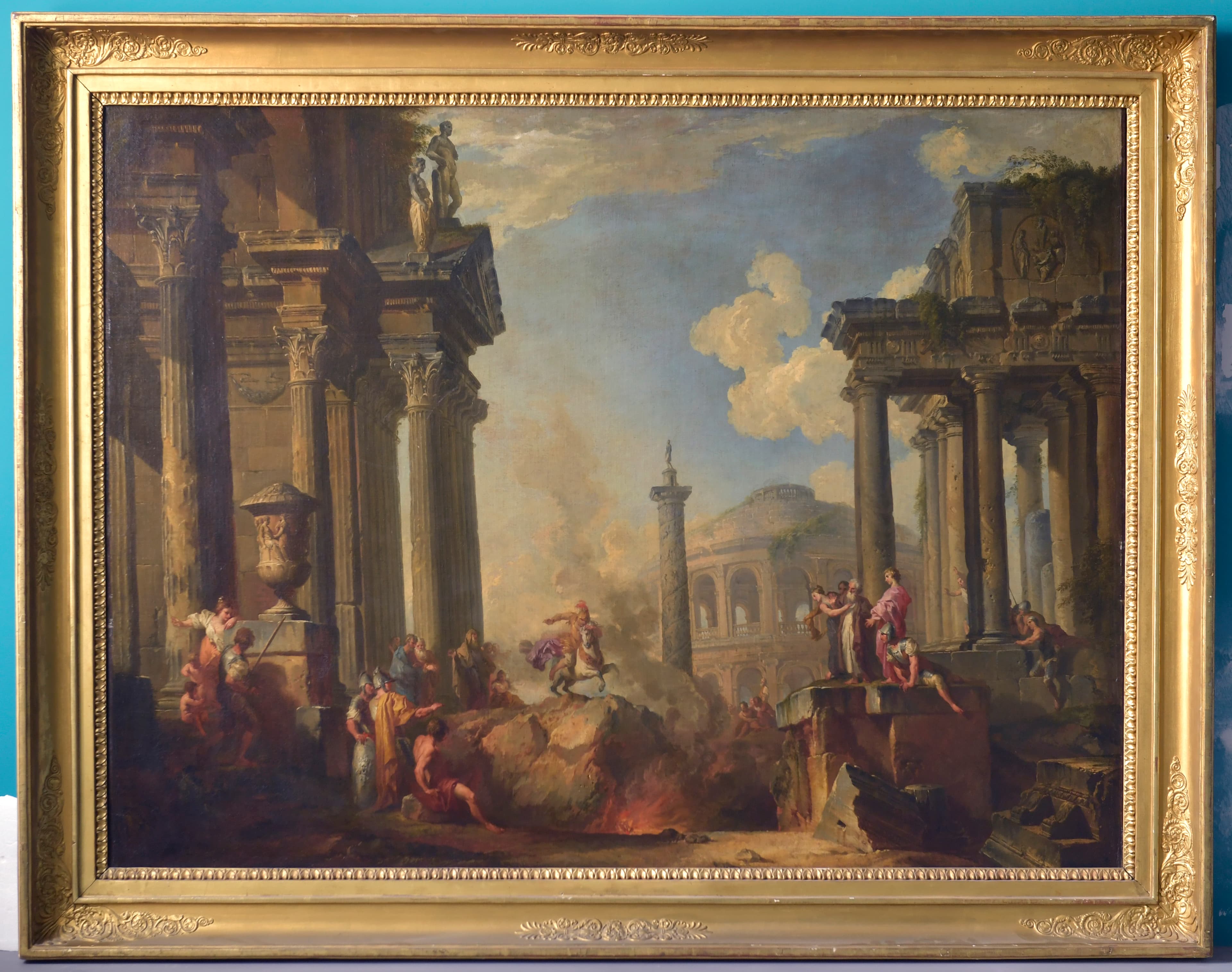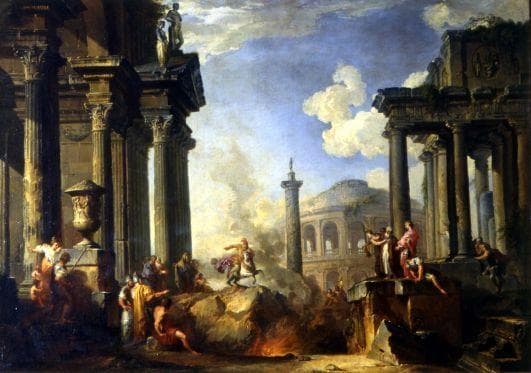 scène historique (Marcus Curtius, suicide, gouffre, cavalier, cheval, personnage, spectateur, flamme, fumée) ; vue d'architecture (ruines, temple, ?, colonne, fronton, statue, obélisque)